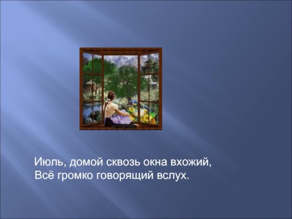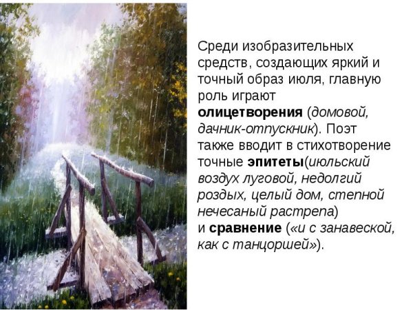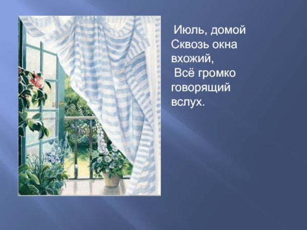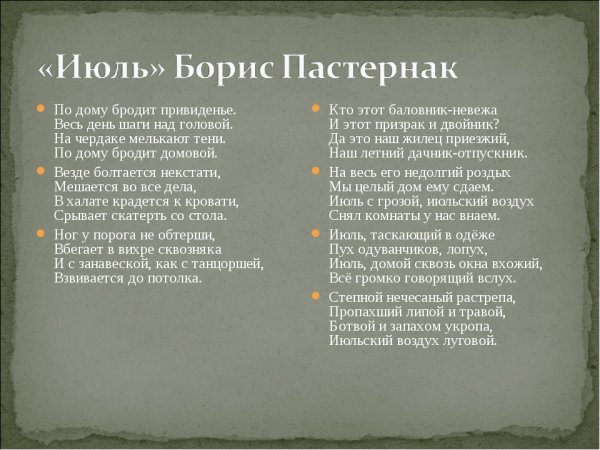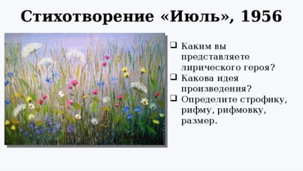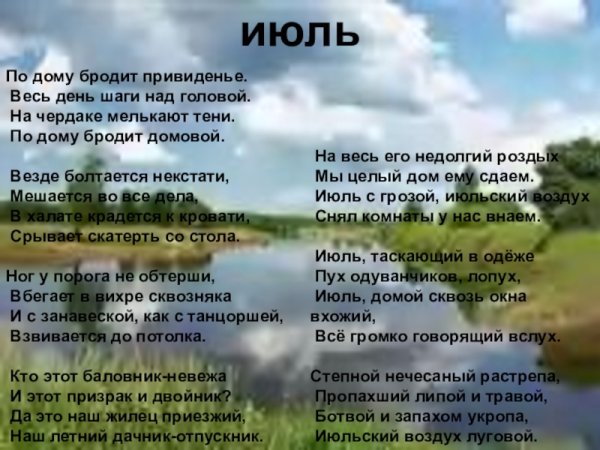 Иллюстрация к стихотворению "Июль" Бориса Пастернака - это визуальное произведение искусства, созданное с целью воплотить визуальную интерпретацию и эмоциональную глубину этого знаменитого стихотворения. Она может быть выполнена в различных техниках и стилях, от классической живописи до современной графики или даже фотографии. Иллюстрация находится в гармонии с метафорическим содержанием стихотворения, передавая его настроение и образность. Возможно, она представляет из себя летний пейзаж с яркими красками и игрой света, а может быть, это абстрактное изображение, которое отражает внутренний мир поэта и его восприятие окружающей действительности. Каждый рисунок или картина, созданные в качестве иллюстрации к "Июлю", могут увлечь зрителя в уникальный мир стихотворения, заставив его пережить эмоции и сопереживать испытываемые поэтом чувства.