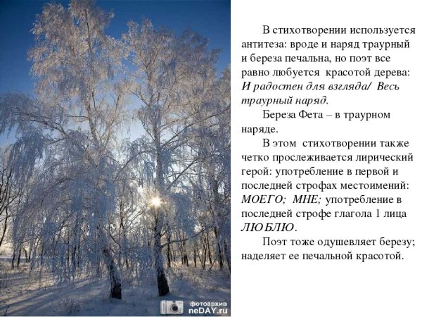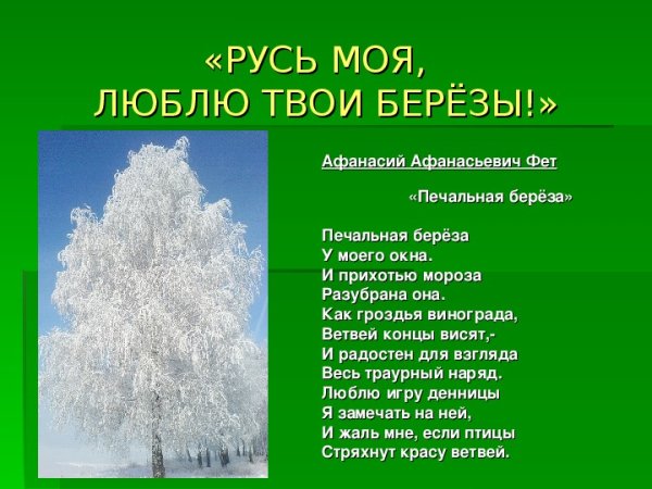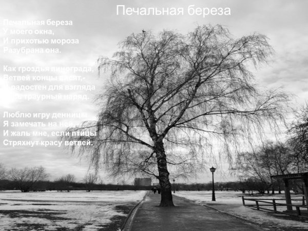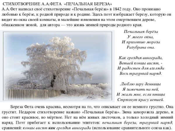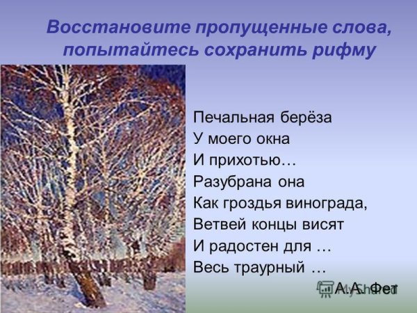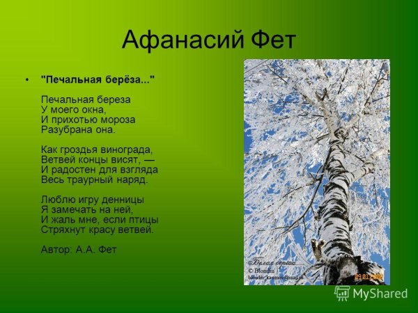 Яркая иллюстрация к стихотворению "Фета печальная береза" воссоздает тонкую и глубокую атмосферу произведения. На фоне мягкого осеннего заката печальная береза, своей изящной и хрупкой силуэтом, выделяется на фоне лесных просторов. Ее ветки нежно прогибаются под ветерком, словно олицетворяя стремление к свободе и изменчивости судьбы. Отражение на поверхности реки добавляет глубину композиции, отображая душевные переживания и лирику, присущие стихотворению. Иллюстрация позволяет зрителю в полной мере ощутить эмоциональную нагрузку произведения и создает ощущение присутствия в мире стихий и непостижимых чувств.