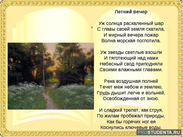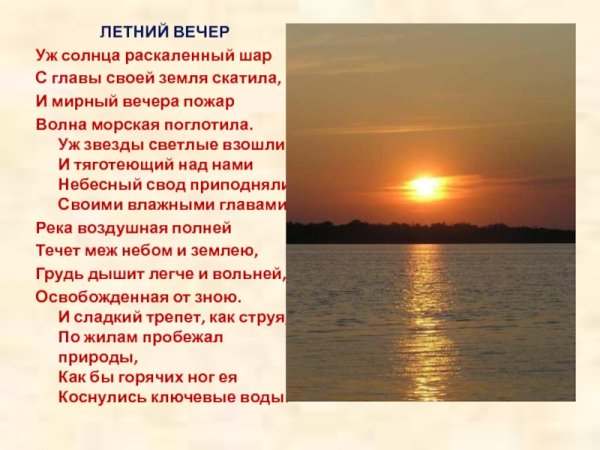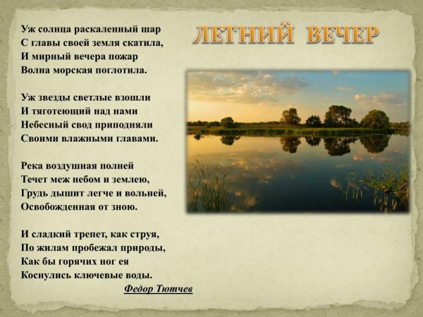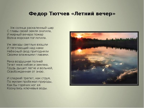 Летний вечер - это удивительное время, когда природа оживает яркими красками и атмосфера наполняется теплотой и романтикой. Оно становится настоящей иллюстрацией к знаменитому стихотворению Федора Тютчева. В его произведении отражены глубокие переживания поэта, его восприятие окружающего мира и эмоции, вызываемые летним вечером. Каждая строчка стихотворения словно раскрывает перед нами образы и звуки, которые присущи этому времени года. Летний вечер по-своему волшебен и загадочен, наполнен волнующей атмосферой, которую можно почувствовать только в этот момент. Иллюстрация к этому стихотворению визуализирует прекрасные летние пейзажи, живописные закаты и игру света, создавая впечатление, будто мы сами попадаем на страницы этого произведения и окунаемся в его мир.
