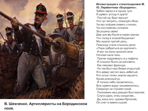 Бородино, стихотворение М.Ю. Лермонтова, великолепно иллюстрирует эпическую красоту и трагичность этой знаменитой битвы. В нем автор передает горячее сердце русского воина, его готовность пролить кровь за Родину и неукротимую силу мужества, которая охватывает каждого бойца на поле сражения. Поэтический язык Лермонтова, его изображение драматических событий и фигур погибших героев создают неповторимую атмосферу, в которой оживает история и ощущается всепоглощающий дух подвига. Читая это произведение, вы вместе с поэтом перенесетесь во времена славных сражений и почувствуете глубокое волнение, вызванное этим значимым историческим событием. Бородино - это величайшая битва, о которой написано много литературы и создано множество картин, но лишь стихотворение Лермонтова способно проникнуть в самые глубины человеческой души и передать ее неповторимые переживания.
