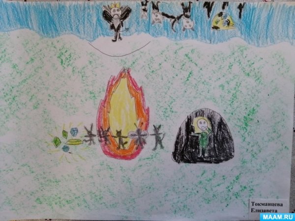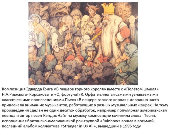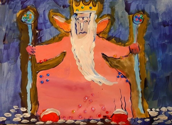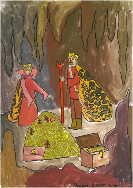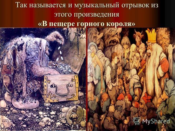 Иллюстрация к произведению "В пещере горного короля" является великолепным визуальным отражением магии и загадочности этого литературного произведения. На рисунке мы видим величественную пещеру, скрытую в глубинах горной гряды, которая служит убежищем для самого могущественного и таинственного короля. Стены пещеры украшены изумрудно-зелеными лианами и светящимися кристаллами, создавая неповторимую атмосферу волшебства. В центре пещеры возвышается трон, на котором сидит горный король - высокий, седой и величественный. Его глаза излучают мудрость и власть, а его руки держат золотой жезл, символ его правления. Вокруг трона стоят верные слуги и стражи, готовые защищать своего правителя любой ценой. Вся эта иллюстрация олицетворяет мощь, тайну и превосходство горного короля, добавляя глубину и интригу к произведению.