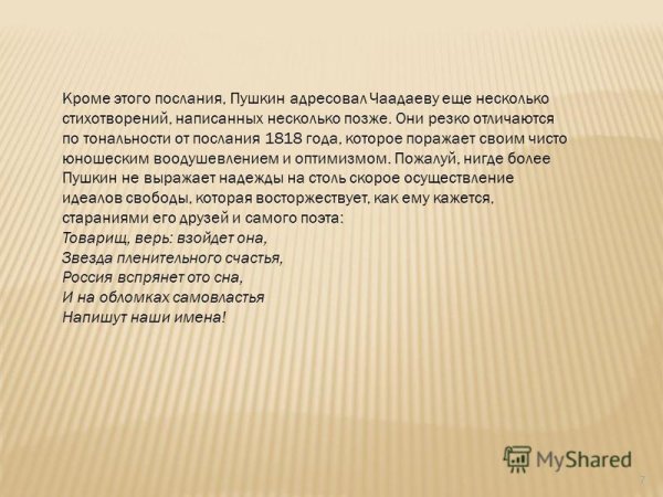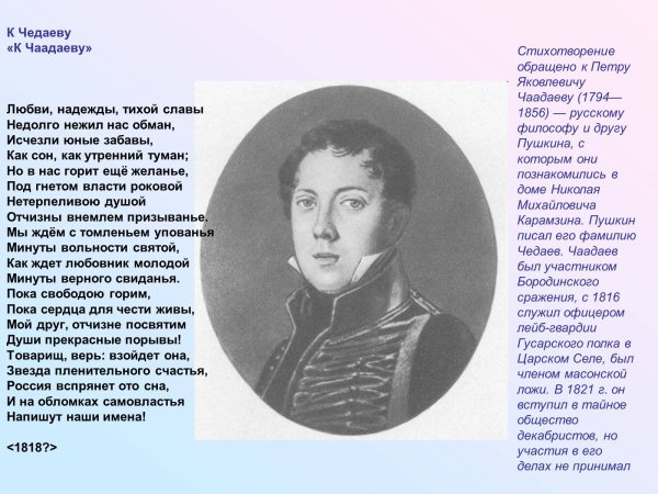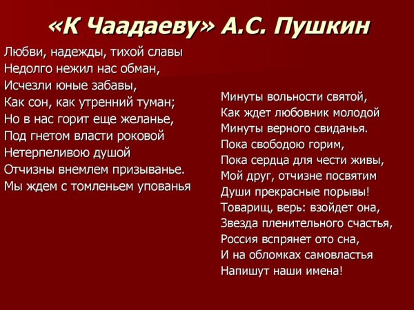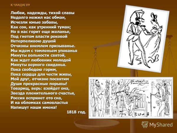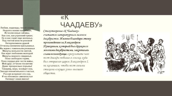 Иллюстрация к стихотворению Пушкина "К Чаадаеву" - это визуальное произведение искусства, которое дополняет и расширяет смысловую глубину самого стихотворения. Она помогает читателю лучше понять и ощутить эмоциональную направленность исходного произведения, а также передает его основные темы и идеи через изобразительные формы. Иллюстрация может быть выполнена в различных стилях и техниках, от классической живописи до современной графики или компьютерной графики, и каждый художник может выбрать свой подход к воплощению образов и символов, выраженных в стихотворении. В результате, иллюстрация к стихотворению Пушкина "К Чаадаеву" становится неотъемлемой частью его интерпретации и способом взаимодействия с читателем, позволяющим проникнуться его глубиной и красотой.