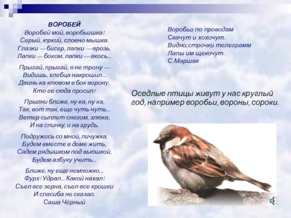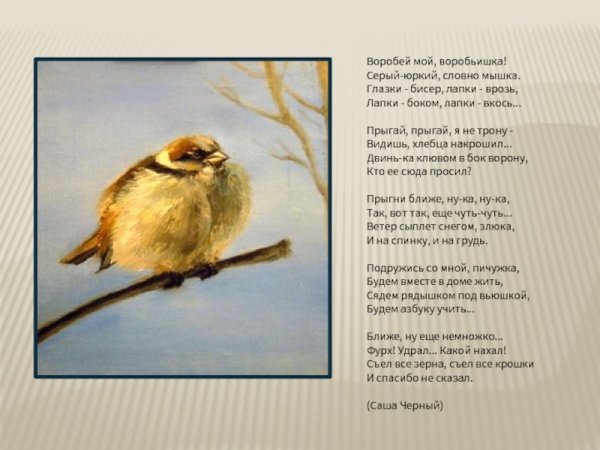 Иллюстрация к стихотворению "Воробей Саша Черный" - это уникальное и замечательное произведение, которое погружает нас в мир приключений и неповторимой атмосферы. Стихотворение рассказывает о воробье по имени Саша, который отличается своей черной окраской и свободолюбивым характером. Иллюстрация выделяется своей живостью и яркостью, передавая каждую эмоцию героя. Она позволяет читателю визуализировать и представить себе образ Саши Черного, его прыжки и полеты, его непредсказуемость и задор. Благодаря этой иллюстрации, стихотворение оживает на страницах книги или на экране, становится еще более замечательным и запоминающимся.