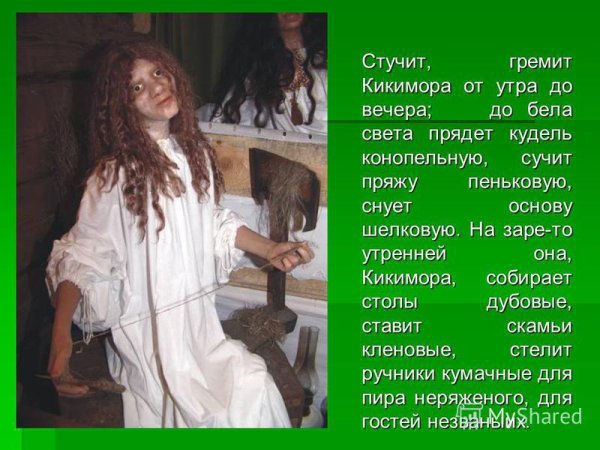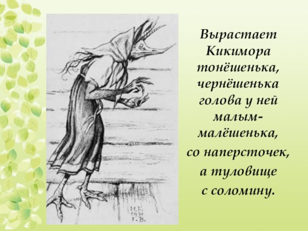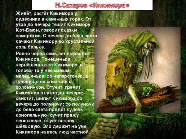 Иллюстрация к произведению "Кикимора" представляет собой визуальное воплощение загадочного и мистического образа этого древнерусского существа. Она захватывает взгляд зрителя своей уникальной атмосферой, в которой сочетаются темные и таинственные оттенки. Картинка передает всю сущность кикиморы - ее загадочность, женственность и хитрость. Иллюстрация притягивает внимание своими деталями, отображая некую силу и энергию, присущую этому существу. Она помогает раскрыть историю и характер кикиморы через ее изображение, создавая интерес и позволяя насладиться весьма увлекательным произведением.