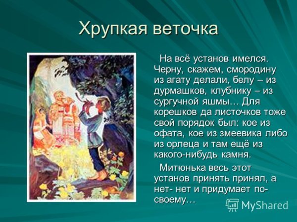 Иллюстрация к произведению Владимира Бажова "Хрупкая веточка" великолепно передает магию и сказочность этой непревзойденной истории. На картине изображена хрупкая веточка, украшенная драгоценными камнями, которая символизирует надежду и чудеса. Яркие и насыщенные цвета создают атмосферу загадочности и притягательности, заставляя зрителя погрузиться в мир фантастических приключений. Эта иллюстрация отлично передает главную идею произведения - силу веры и возможность чудес даже в самых невероятных ситуациях. Она запоминается своей изящностью и тонкостью исполнения, оставляя глубокий след в сердцах читателей и зрителей.