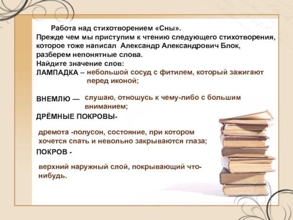 Блок сны - это уникальное творение, которое объединяет в себе стихотворение и иллюстрацию. Этот блок погружает читателя в мир глубоких сновидений, где каждая строчка становится каким-то загадочным образом, а каждая иллюстрация оживает перед глазами. Стихи Александра Блока, проникнутые мистической атмосферой, переносят нас в другую реальность, где время и пространство теряют своё значение. Иллюстрации же, созданные талантливыми художниками, воплощают визуальные образы, помогая нам разгадать тайны и символику каждого стихотворения. Блок сны - это не просто книга, это полное погружение в мир искусства и философии, в мир мечты и вдохновения.
