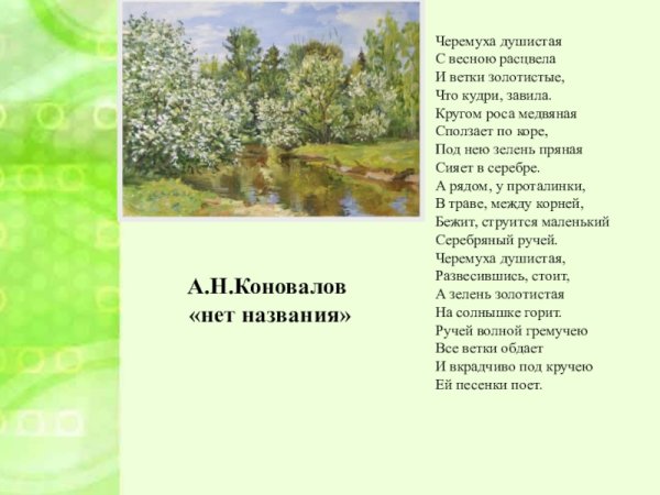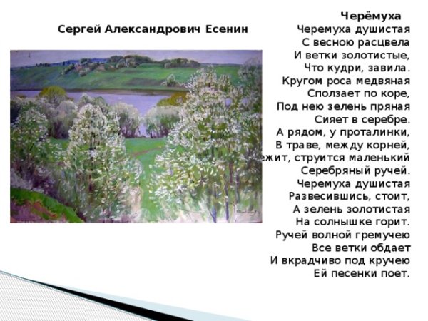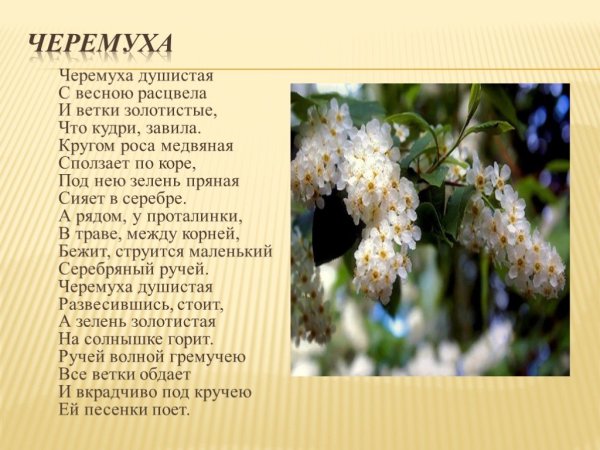 Черемуха, символ весны и красоты природы, навсегда останется в сердце поэта Сергея Есенина. В его стихотворении "Черемуха" он передает свою любовь к этому дереву, его нежные цветы и утонченный аромат. Каждая строчка стихотворения словно иллюстрация, рисующая перед нами образы природы и создающая особую атмосферу весны. Черемуха для Есенина становится метафорой жизни, с ее яркими красками и быстротечностью. Это стихотворение отлично иллюстрирует его чуткое восприятие окружающего мира и его тонкий поэтический стиль.