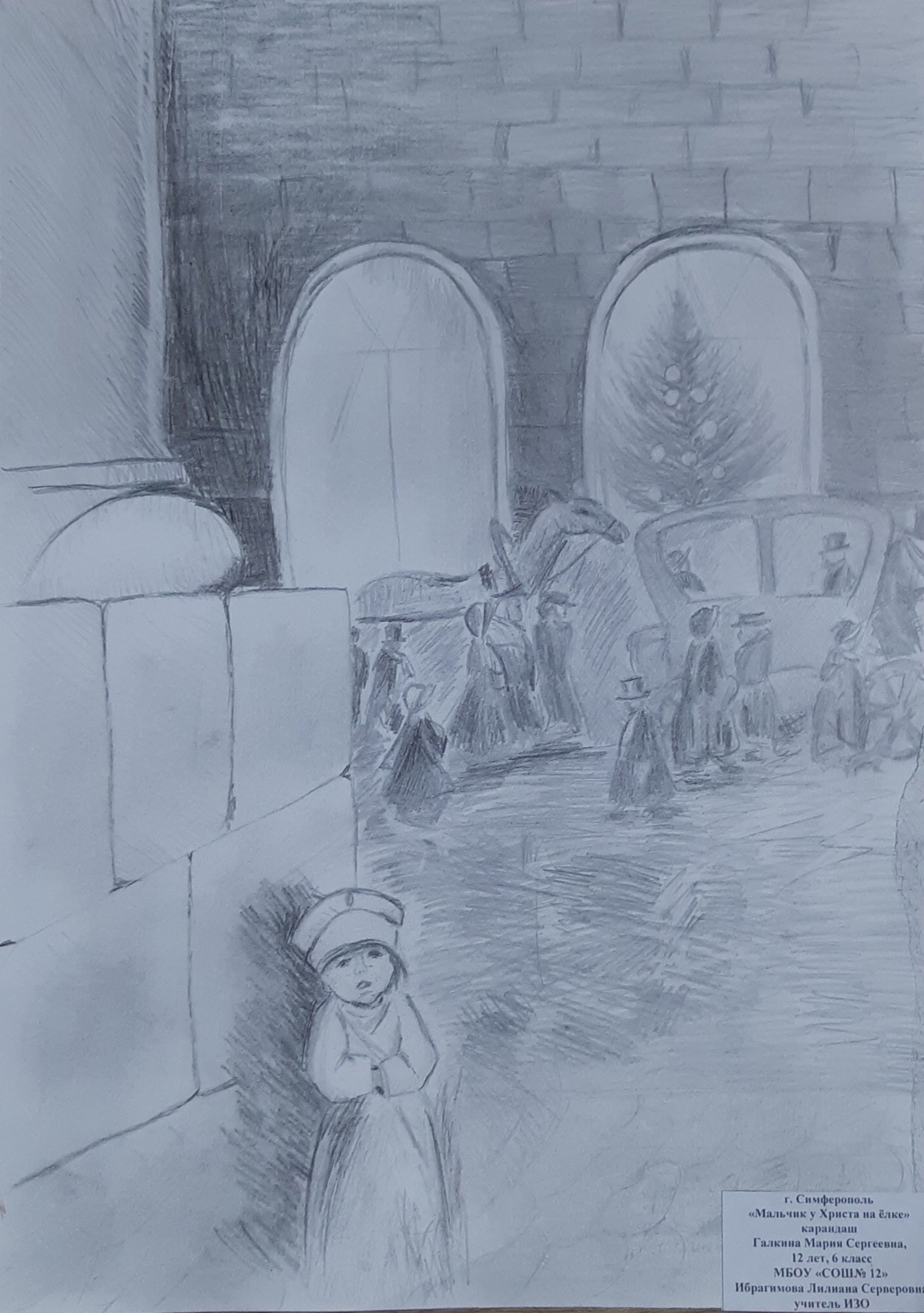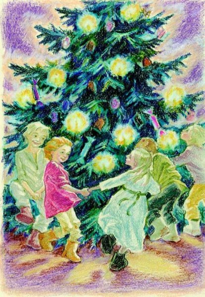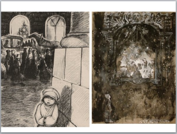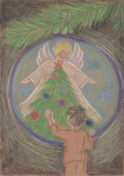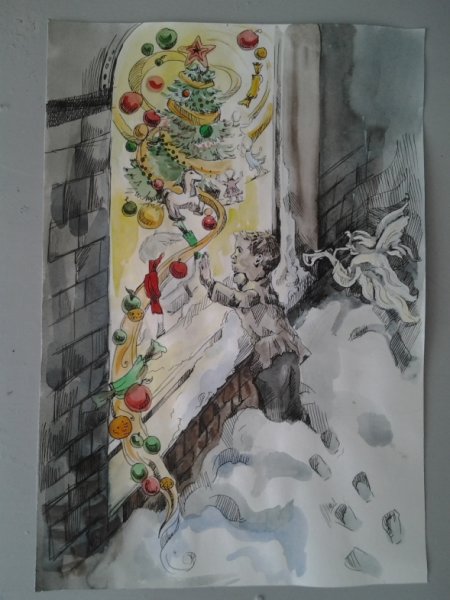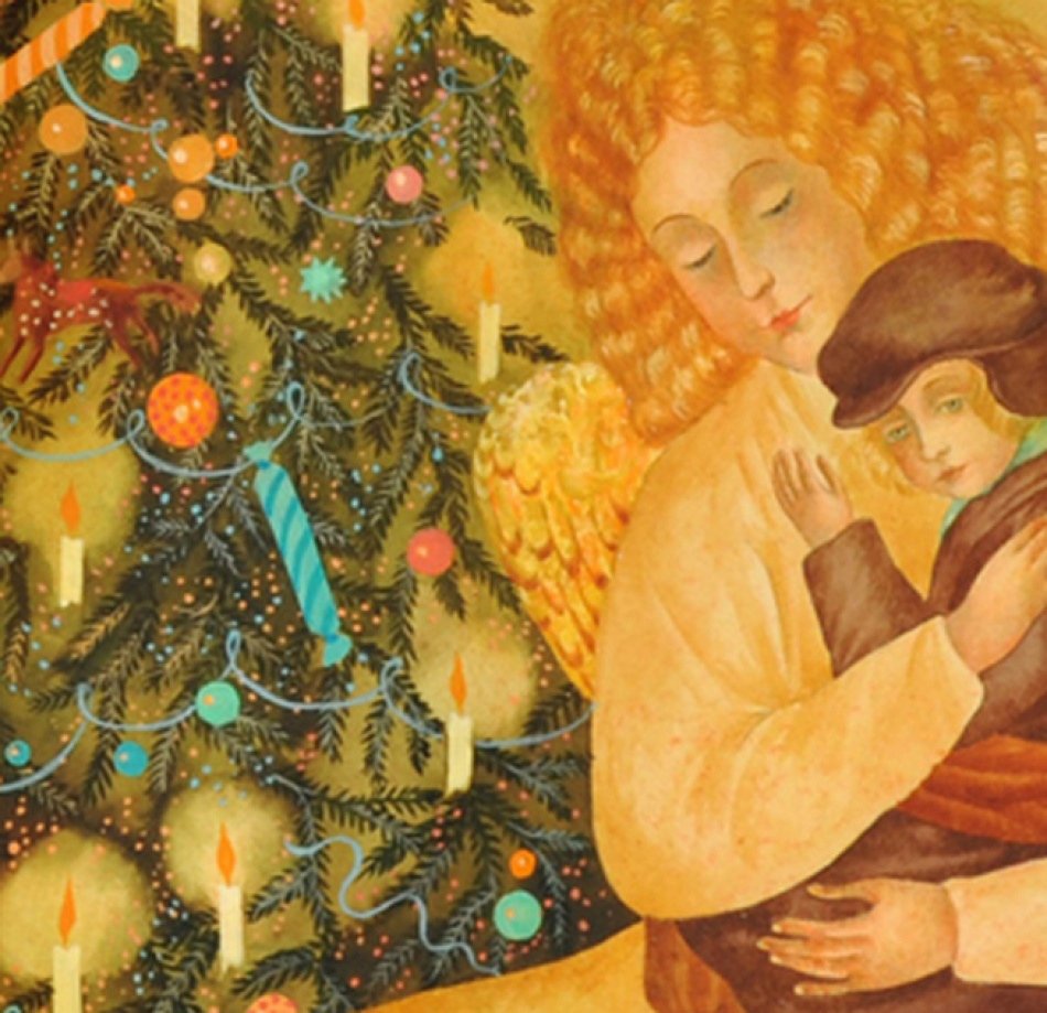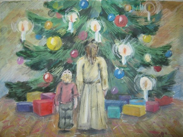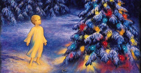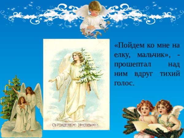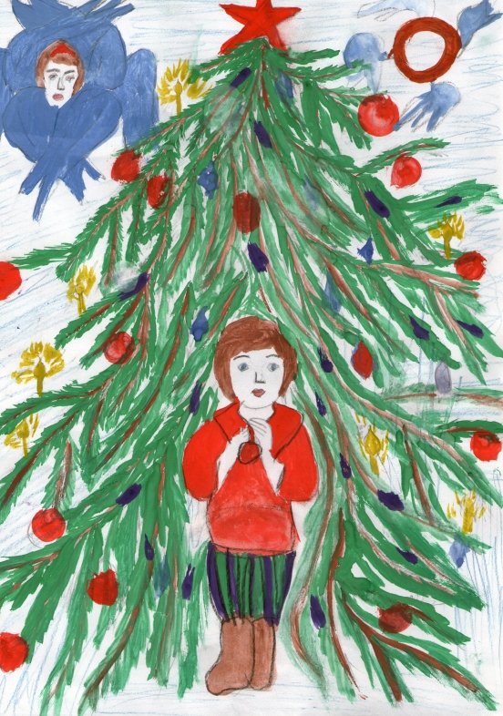 На этой яркой иллюстрации представлен мальчик, который стоит под украшенной елкой. Его взгляд сосредоточенно направлен на небольшую фигурку Христа, которая красуется в верхней части ёлочной ветки. Мальчик выглядит зачарованным и полон благоговения перед этим символом Рождества. Каждая деталь иллюстрации, начиная от великолепных игрушек до сияющих огней, создают атмосферу радости и торжества. Эта иллюстрация прекрасно дополнит рассказ и позволит читателям окунуться в волшебный мир Рождества.