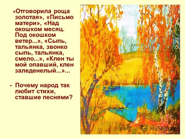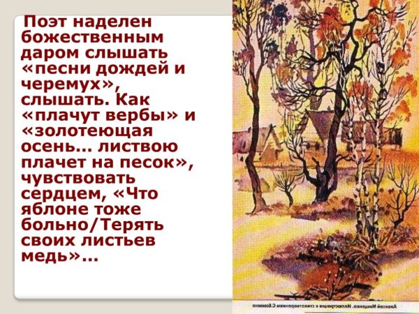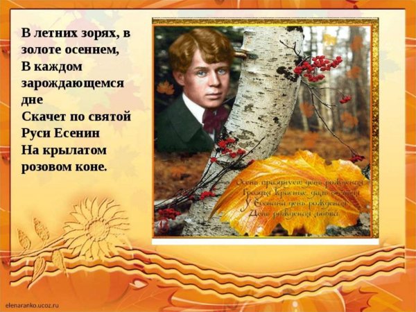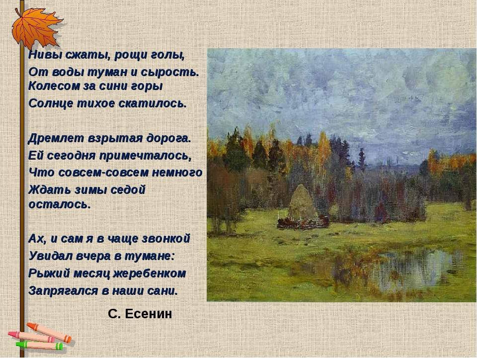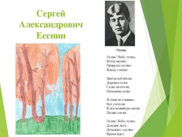 Иллюстрация к стихотворению "Осень" Есенина - это великолепное творческое произведение, которое передает всю глубину и красоту осеннего времени года. В нем автор описывает яркие осенние краски, звуки и атмосферу, создавая живописную картину природы. Иллюстрация к данному стихотворению должна быть насыщенной и выразительной, отражая романтику и меланхолию осени. Она может включать в себя изображения желтых и оранжевых листьев, падающих с деревьев, тумана, причудливо искривленных веток и умиротворяющего вида пейзажей. Красочные картины осенней природы, переданные в иллюстрации, помогут читателю еще глубже погрузиться в атмосферу стихотворения и раскрыть его эмоциональные нюансы.