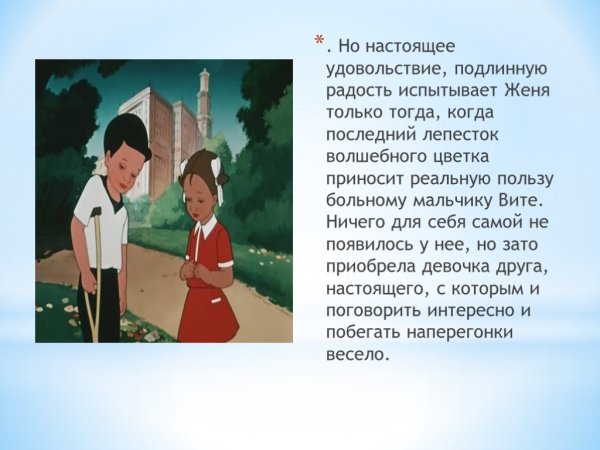 Иллюстрация к произведению "Цветик-семицветик" – прекрасное воплощение магии и сказочности этого знаменитого произведения. На рисунке изображены яркие цветы, каждый из которых имеет свой уникальный оттенок и символизирует определенную эмоцию или качество. Каждый лепесток нарисован с такой тонкостью и детализацией, что словно можно почувствовать их нежность и аромат. Иллюстрация позволяет читателю окунуться в мир приключений и добрых дел, которые ждут главных героев в этой увлекательной истории. Разнообразие цветов и их яркий цветовой спектр создают ощущение радости и восхищения, заставляя нас переживать все эмоции вместе с героями. Эта иллюстрация является неотъемлемой частью произведения "Цветик-семицветик", оживляя текст и помогая визуализировать описанные события и персонажей.