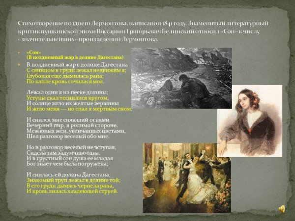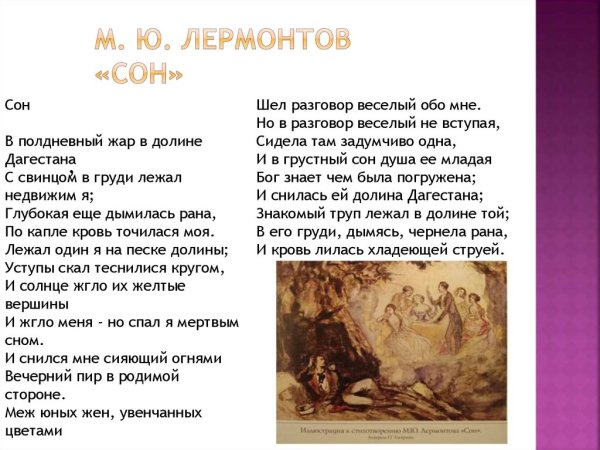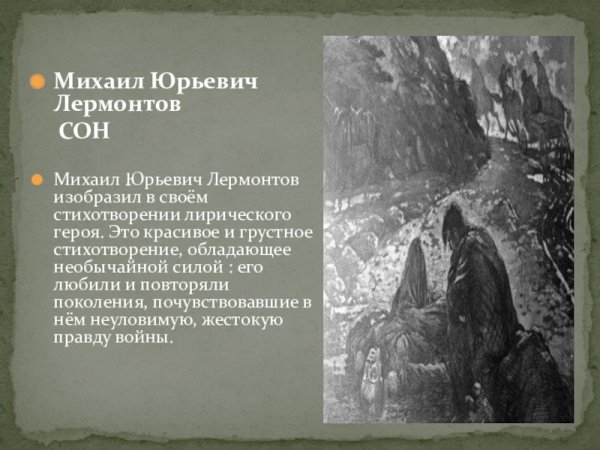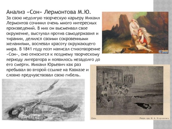 Иллюстрация к стихотворению Лермонтова "Сон" представляет собой прекрасное воплощение мироздания и философии произведения. В ней автор передает глубокие эмоции и мысли главного героя, погружая зрителя в атмосферу загадочности и таинственности сна. Особое внимание уделяется деталям и композиции, создавая гармоничное сочетание цветов и форм. Иллюстрация не только демонстрирует художественное мастерство, но и помогает воссоздать атмосферу произведения, раскрывая его смысловую глубину.