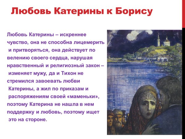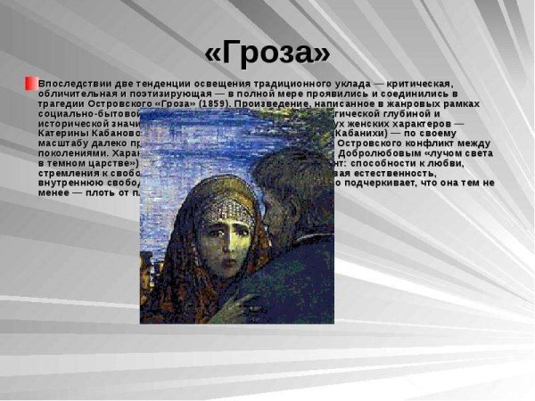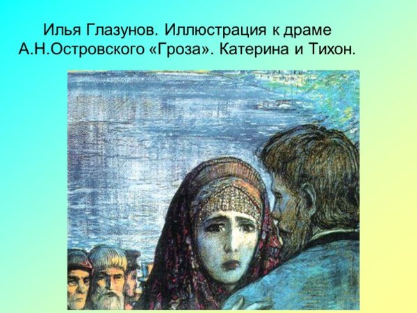 Иллюстрация к произведению "Гроза" является ярким и выразительным отображением событий и эмоций, присутствующих в этой знаменитой пьесе Александра Островского. На рисунке можно увидеть изображение грозового неба, наполненного мрачными тучами, которые символизируют наступление страшной бури в жизни главных героев. В центре рисунка расположены два человеческих образа - Аксюша и Борис. Их позы и выражение лиц наглядно передают напряжение и нерешительность, характерные для этих персонажей. Таким образом, иллюстрация насыщена символикой и отражает ключевой момент драмы, создавая атмосферу загадочности и неопределенности, которая присуща произведению "Гроза".