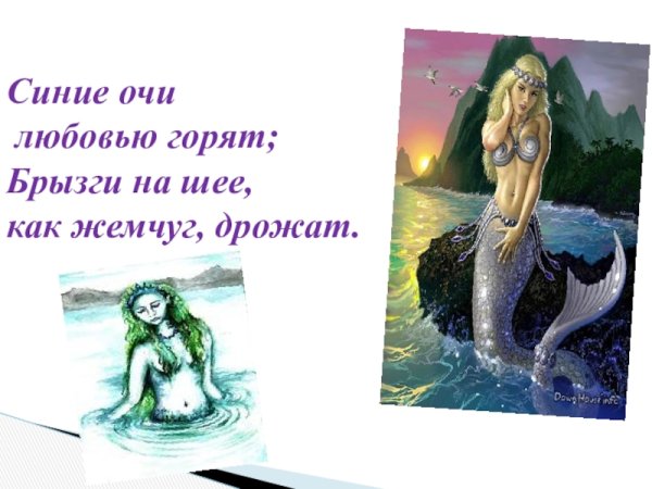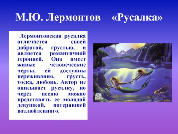 Иллюстрация к стихотворению Лермонтова "Русалка" - это визуальное воплощение загадочного и таинственного мира, описанного в поэтическом произведении. Она передает атмосферу сказочности и мистики, раскрывая главную героиню - русалку. Рисунок может содержать изображение прекрасной морской нимфы, погруженной в лазурные воды океана или реки, окруженной водорослями и кораллами. Часто на иллюстрации можно увидеть русалку, обрамленную светящейся голубой пеленой, которая придает ей неприступность и загадочность. Важным элементом могут быть также цветы, символизирующие любовь и привлекательность русалки. Все это помогает создать впечатление о чарующем и необыкновенном мире, в который погружается читатель стихотворения Лермонтова.