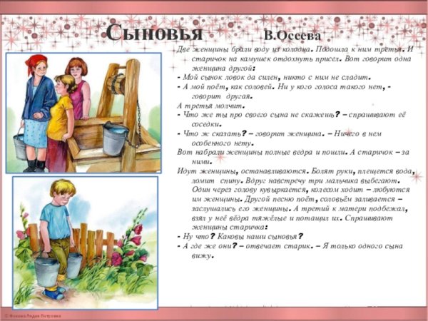 Великолепные иллюстрации к одному из самых знаменитых рассказов Осеевой "Сыновья" удивят и восхитят каждого читателя. Эти воспоминания о детстве и отношениях между братьями оживают на страницах книги благодаря талантливому художнику, который передал всю глубину и эмоциональность произведения через свои картины. Каждая иллюстрация яркая и выразительная, она заставляет зрителя проникнуться тонкими переживаниями и перенестись в мир героев. Благодаря этим иллюстрациям, чтение рассказа "Сыновья" становится еще более цельным и захватывающим, позволяя окунуться в мир ностальгии и семейных отношений.
