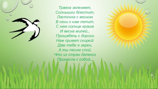 Иллюстрация к стихотворению "Травка зеленеет, солнышко" ярко передает образы природы и создает атмосферу летнего дня. На картине виднеется свежий зеленый цвет травы, которая расстилается на гладкой поверхности земли. Вдали проступает солнечный свет, освещая все вокруг яркими лучами. Ощущение тепла и свежести пронизывает всю композицию, придавая ей живость и энергию. Такая иллюстрация не только передает красоту природы, но и вызывает чувство радости и восторга у зрителя.