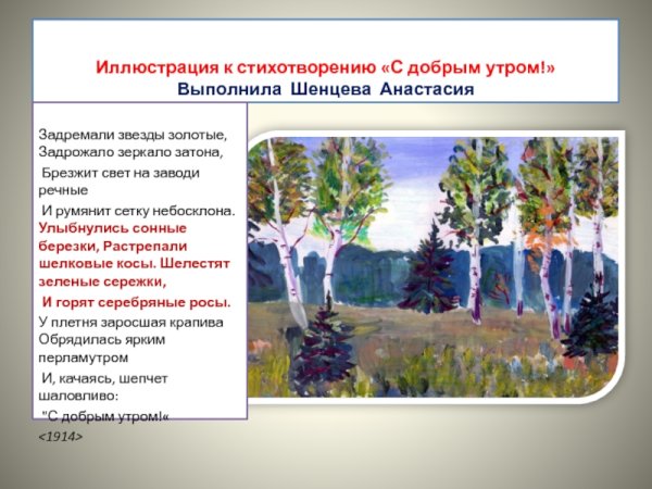 Иллюстрация к стихотворению "С добрым утром, Есенин" - это визуальное воплощение идеи и настроения, которые привносит в нашу жизнь знаменитая поэтическая работа Сергея Есенина. Очаровательные осенние пейзажи, сочетание ярких красок и мягкого света создают атмосферу тепла, умиротворения и радости пробуждающегося утра. Через изображение природы, автор передает нежность и красоту мира, а также олицетворяет этот период как время новых возможностей и начала чего-то прекрасного. Иллюстрация становится символом пробуждения души и призывает насладиться каждым мгновением жизни, предлагая читателю ощутить всю гамму эмоций, которые заложены в стихотворении.