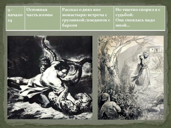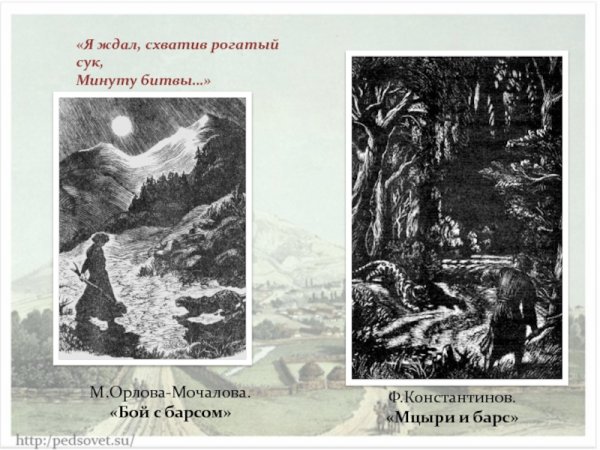 Великолепное произведение Михаила Юрьевича Лермонтова "Мцыри" воплощает в себе неповторимую атмосферу борьбы с несправедливостью и силами зла. Как же захватывающе было это противостояние главного героя, юного Мцыри, и его страстного барса! И теперь фанаты этого литературного шедевра искусства могут насладиться прекрасными иллюстрациями к этому произведению. Талантливые художники передали в своих работах дух приключений и опасности, которые сопровождают Мцыри в его бою с барсом. Они оживили страницы романтической поэмы, позволив каждому читателю окунуться в мир литературы и насладиться красотой и силой борьбы героев. Эти иллюстрации являются настоящим произведением искусства и прекрасным способом оживить незабываемую историю Мцыри и его битвы с барсом.