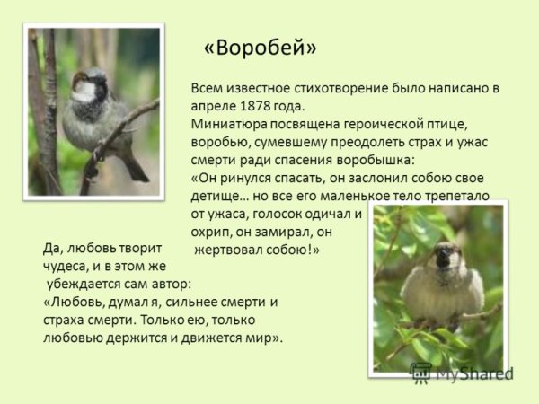 Иллюстрация к стихотворению в прозе "Воробей" Ивана Тургенева - это визуальное воплощение глубокой эмоциональности и нежности этого произведения. Она передает нам поэтическую атмосферу, рассказывая о маленьком птичке, которая является символом свободы и независимости. На иллюстрации мы можем увидеть хрупкого воробья, летящего в высоком небе среди облачного полотна. Его крылья расправлены, словно он переполняется энергией жизни и стремится к своим мечтам. Цветовая палитра иллюстрации отражает нежность и спокойствие стихотворения, создавая впечатление легкости и воздушности. Благодаря такой иллюстрации, мы можем еще глубже вникнуть в суть произведения и почувствовать его магию.
