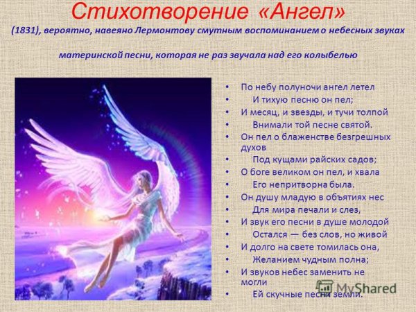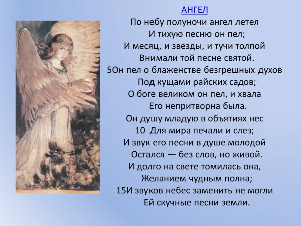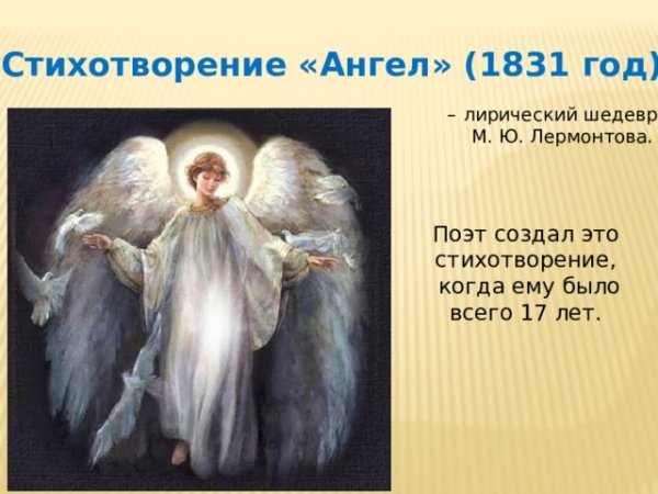 Иллюстрация к стихотворению "Ангел" Михаила Юрьевича Лермонтова – это удивительное и вдохновляющее произведение, которое переносит нас в мир духовного искусства. В своей работе художник передает глубину и эмоциональность стихотворения, отображая изображение ангела – символа добра, силы и света. Прекрасная композиция и цветовая гамма создают атмосферу благородства и таинственности, позволяя зрителю ощутить образ ангела и проникнуться его непостижимой красотой. Эта иллюстрация является потрясающим воплощением поэтического мира Лермонтова и призывает нас заглянуть в бесконечность и мистическую сущность человеческой души.