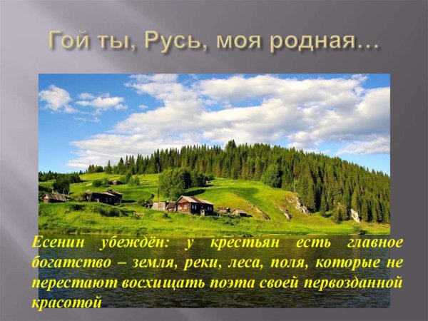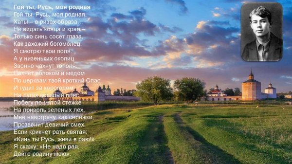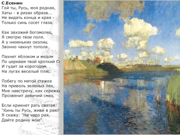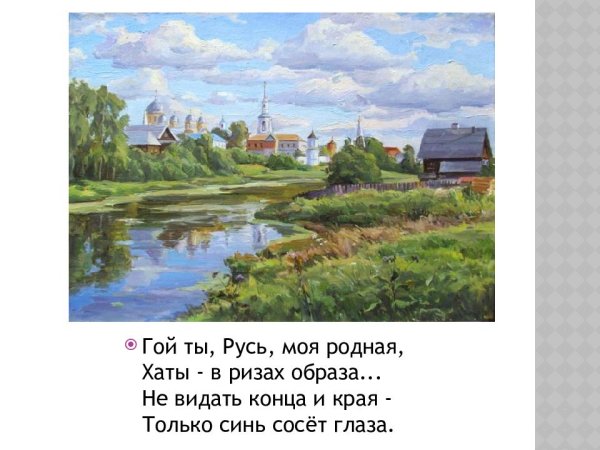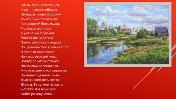 Прекрасная иллюстрация, которая великолепно дополняет стихотворение "Гой ты, Русь моя родная". На картине можно увидеть яркие краски и изображение русской природы во всей ее красе. Возможно, на иллюстрации изображены поляны с пышной травой, раскинутые под небом сияющими звездами. Вдали виднеются горы, покрытые лесами и озерами. А может быть, на рисунке изображены символы России - Матушка-Русь, Балалайка или Кремль. Иллюстрация передает атмосферу любви к родине, патриотизма и гордости за свою страну. Она поражает своей красотой и вызывает глубокие эмоции у зрителя, усиливая силу и значимость стихотворения "Гой ты, Русь моя родная".