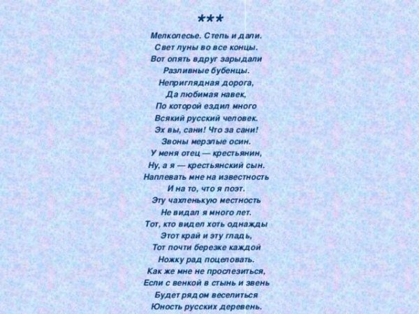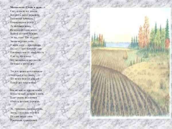 Иллюстрация к стихотворению "Мелколесье, степь и дали" Есенина – это визуальное воплощение магии и красоты природы, которую поэт так искусно описывает в своем произведении. Картина передает образы золотистых полей и бескрайних просторов, наполненных тишиной и покоем. В живописном исполнении, каждая деталь создает атмосферу умиротворения и гармонии с окружающим миром. Яркие цвета, игра света и тени, а также изящные линии перенесут зрителя в мир Есенина, где он сможет почувствовать все те эмоции и настроения, которые пронизывают его стихи. Эта иллюстрация не только отражает главную идею стихотворения, но и пробуждает в душе зрителя воспоминания о красоте природы и чувства гармонии с ней.