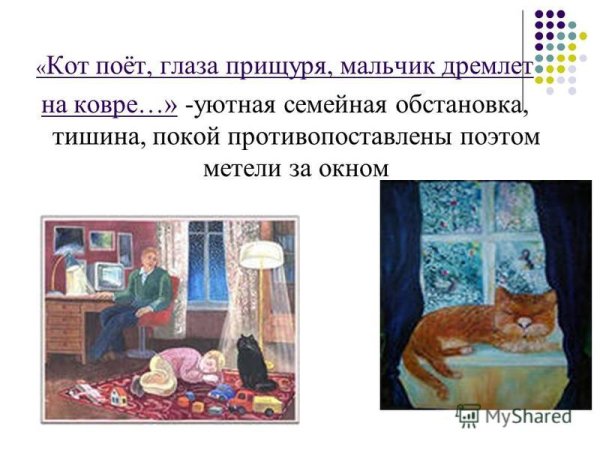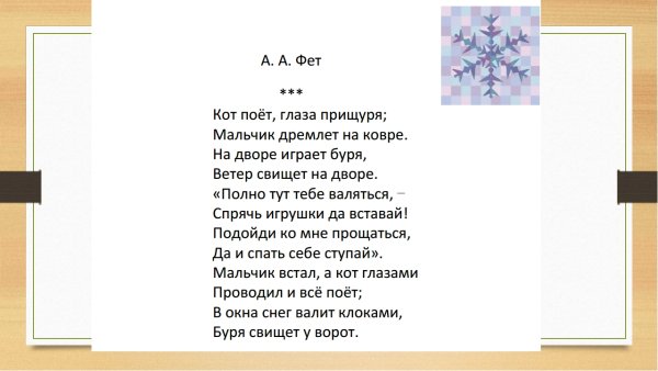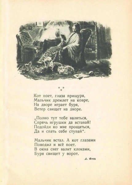 Представьте себе красочную иллюстрацию, которая оживляет стихотворение Фета "Кот поет". Главным элементом этой иллюстрации является глаза прищуряющегося кота. Стремительные линии плавно переплетаются, создавая ощущение движения и ритма, воплощая музыкальность стихотворения. Глаза кота испускают свет, демонстрируя его внутреннюю энергию и страсть к пению. В целом, эта иллюстрация увлекает зрителя в мир поэзии Фета и позволяет почувствовать волшебство его слов.
