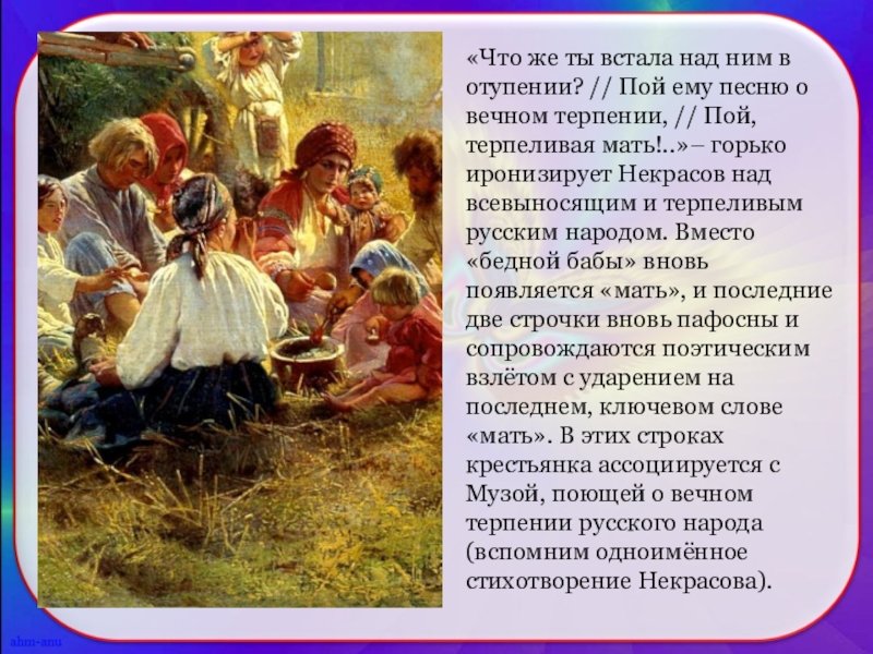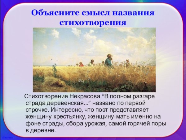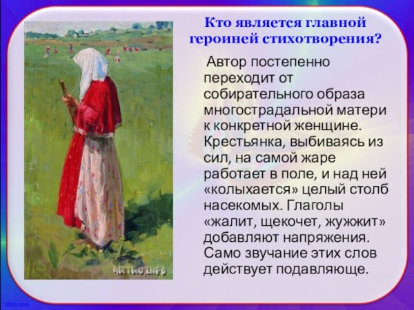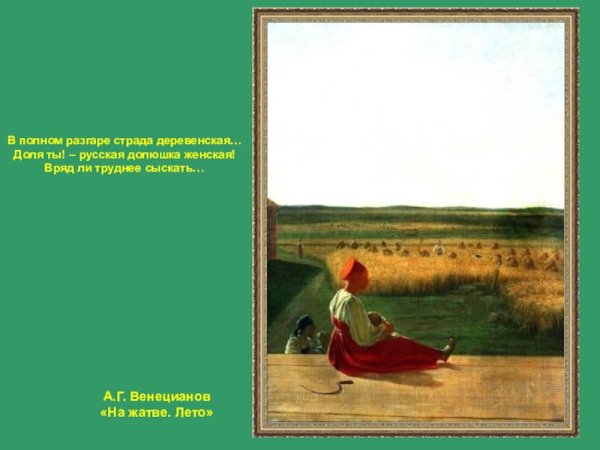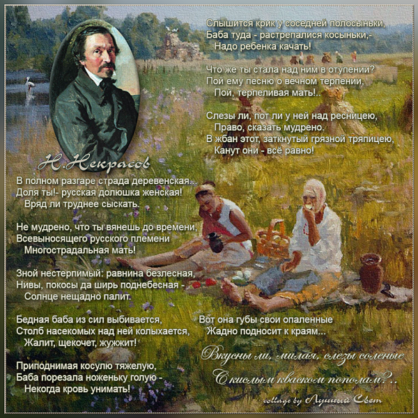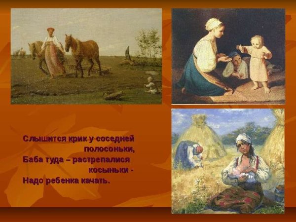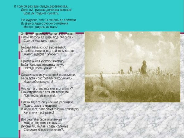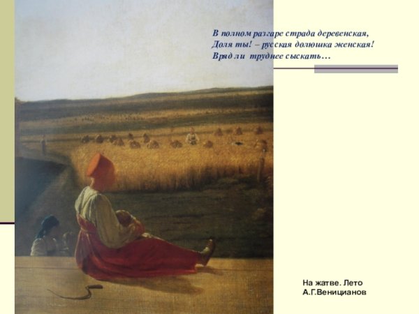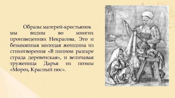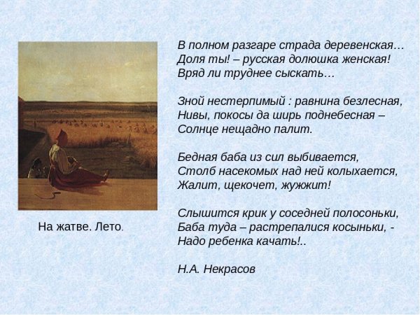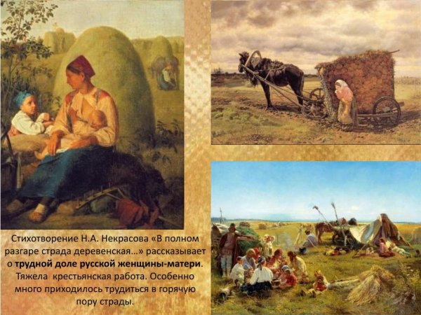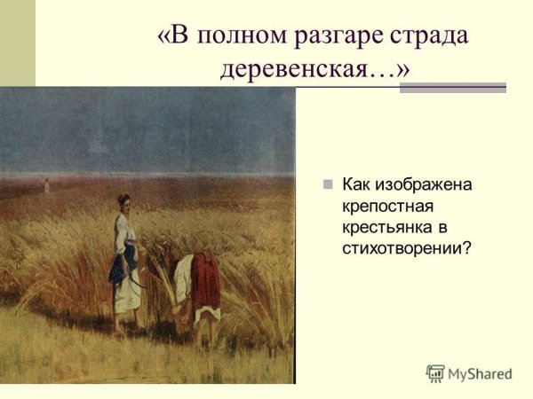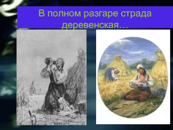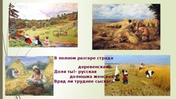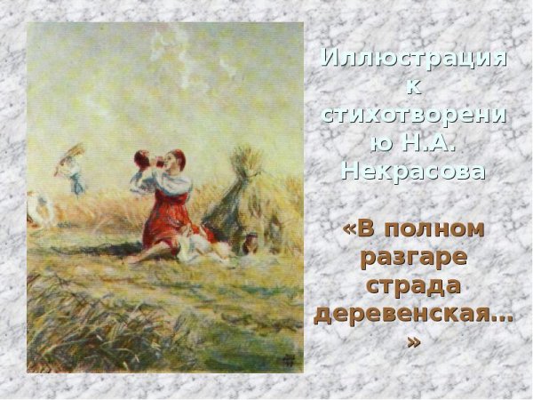 Иллюстрация к стихотворению Некрасова "В полном разгаре страда деревенская" воплощает образы и настроение, описанные поэтом. Она передает жизнь и труд мужчин и женщин, проживающих в сельской местности и сталкивающихся с тяжелыми условиями бытия. В иллюстрации может быть изображено разнообразие повседневных сцен из деревенской жизни: люди, занимающиеся полем и скотом, сбором урожая, лица, отражающие усталость и надежду, а также природа вокруг с ее неизменной красотой и таинственностью. Используя специальные цветовые и композиционные приемы, иллюстратор может дополнить и усилить эмоциональную глубину произведения, подчеркнув его социальную значимость и актуальность до сих пор. В результате, иллюстрация к стихотворению Некрасова "В полном разгаре страда деревенская" станет важным визуальным дополнением к тексту, помогая читателю еще глубже погрузиться в мир деревни и увидеть его скрытые стороны.