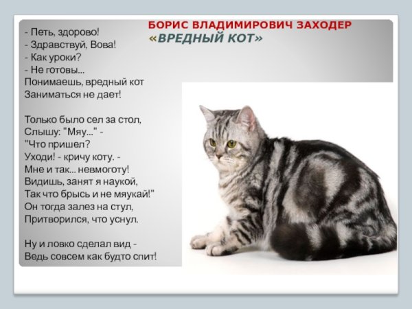 Вредный кот - это необычное стихотворение, которое описывает забавные и порой непонятные поступки самого беспокойного и живописного кота. Сочинение наполнено пикантным юмором и заставляет читателя улыбнуться от его странных выходок. А иллюстрации, сопровождающие каждый стих, добавляют особую прелесть к произведению, позволяя визуально представить все приключения этого кота. Если вы хотите окунуться в мир смешных и незабываемых историй, то Вредный кот - именно то, что вам нужно!