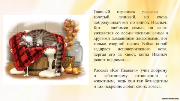 Иллюстрация к рассказу "Кот Иваныч" ярко иллюстрирует забавные приключения главного героя и его верного спутника - кота Иваныча. На рисунке можно увидеть, как Иваныч с любопытством исследует окружающий мир, прыгает на деревья, подкрадывается к птичкам и играет с городскими жителями. Он предстает перед нами во всей своей красе и обаянии, смешной и очаровательный. Эта иллюстрация олицетворяет доброту и веселый характер кота Иваныча, заставляя нас с улыбкой следить за его приключениями и вдохновляя нас на своеместо радость и игривость.