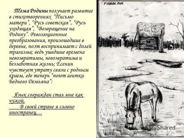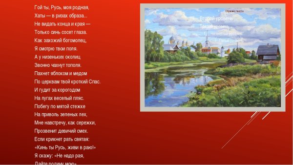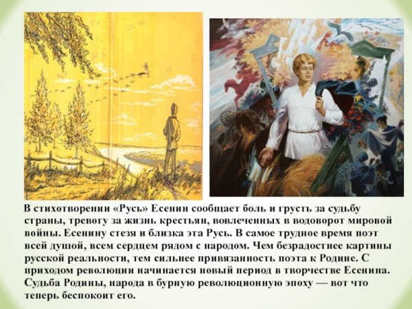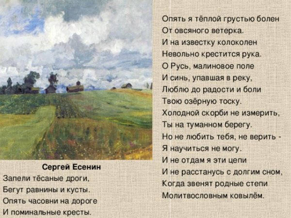 Иллюстрация к стихотворению "Русь" Есенина – это великолепное произведение искусства, которое передает всю глубину и красоту этого знаменитого стихотворения. На изображении можно увидеть пейзаж родной русской земли, обрамленный яркими осенними красками. В нем присутствует ощущение тепла и уюта, которое олицетворяет дух русской природы. Картина воспевает родину и ее прекрасные природные ландшафты, создавая атмосферу тоски и меланхолии, характерные для лирики Сергея Есенина. Иллюстрация к стихотворению "Русь" Есенина является прекрасным дополнением к этому великому произведению русской поэзии, позволяющим еще глубже погрузиться в его суть и насладиться его эмоциональной силой.