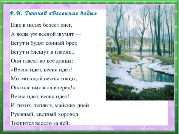 Иллюстрация к стихотворению Тютчева "Весна" воссоздает прекрасный образ природы, пробуждающейся от зимней спячки. Нежные оттенки зелени, яркие цветы и легкий пух на деревьях передают атмосферу первых теплых дней года. В ней можно увидеть чарующую красоту весеннего ландшафта, олицетворяющую обновление и возрождение. Иллюстрация погружает зрителя в мир пробуждающейся природы, наполняет его радостью и надеждой на новые начинания. Это идеальное дополнение к стихотворению, позволяющее в полной мере ощутить великолепие весны во всем её великолепии.