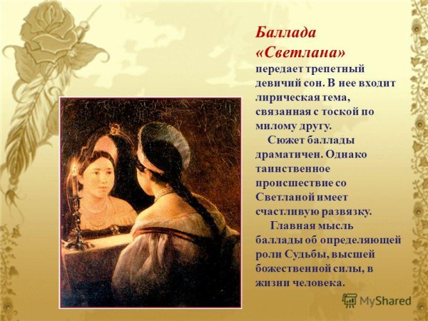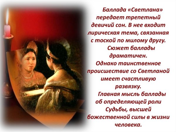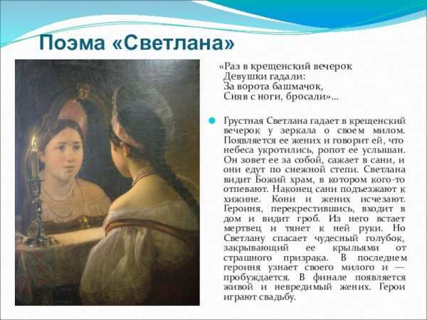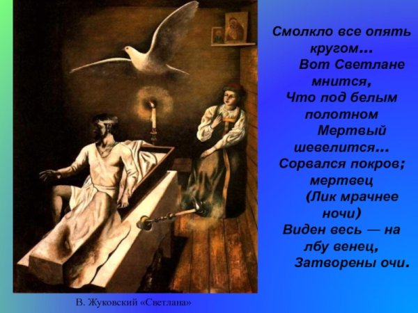 Иллюстрация к стихотворению "Светлана" Жуковского – это яркое и эмоциональное произведение, которое воссоздает картины из жизни главной героини Светланы. В нем раскрывается ее красота, нежность и загадочность, а также ее противостояние судьбе. Иллюстрация передает всю глубину и сложность переживаний героини, позволяя зрителю окунуться в мир стихотворения и почувствовать его эмоциональную напряженность. Каждая деталь на рисунке тщательно проработана, чтобы передать основные идеи и настроение произведения. Иллюстрация к стихотворению "Светлана" Жуковского является неотъемлемой частью его интерпретации и помогает зрителям еще лучше понять и ощутить глубину и красоту этого литературного шедевра.