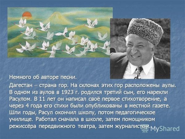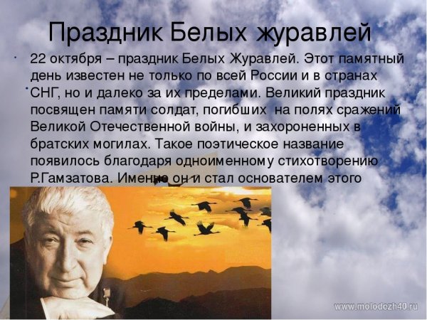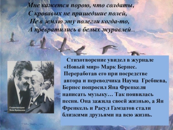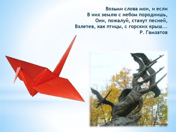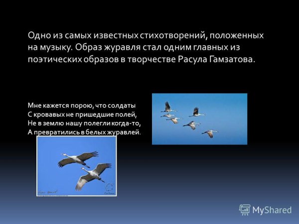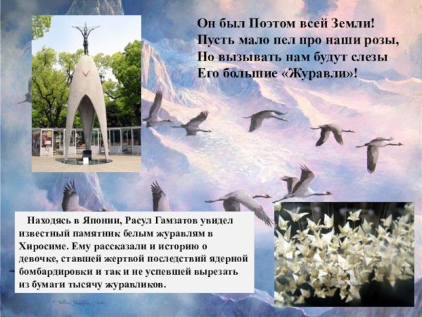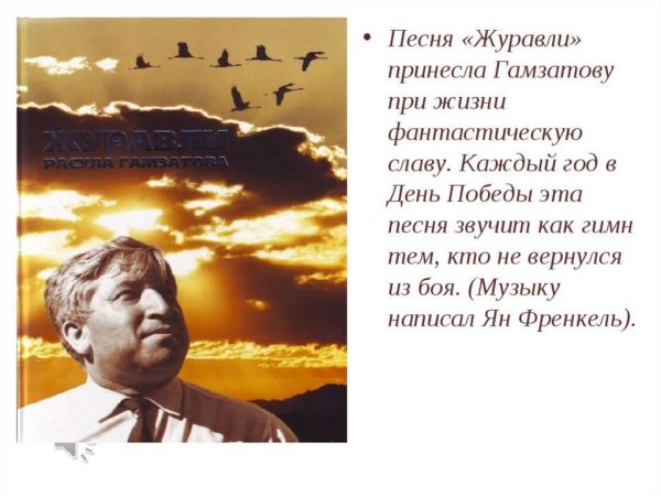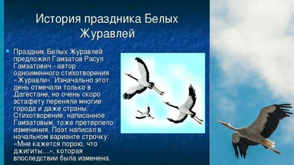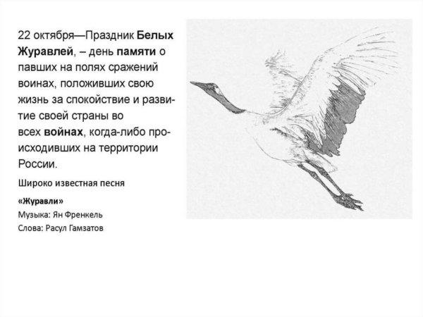 Иллюстрация к стихотворению "Журавли" Гамзатова - это визуальное проявление мелодии и глубины этого знаменитого произведения. Журавли, символизирующие свободу, путешествие и силу духа, олицетворяют стремление человека к высшим целям и идеалам. Иллюстрация передает эмоциональную атмосферу стихотворения, где каждая линия и цвет создают пронзительные образы природы и переживания автора. В ней можно увидеть нежность и грацию журавлей, которые возвышаются в небеса и пролетают над просторами нашей родины. Она захватывает взгляд и позволяет ощутить всю глубину поэтической мысли и величие этой композиции. Иллюстрация к стихотворению "Журавли" Гамзатова призвана возбудить в нас воспоминания о духовном странствии и вечной красоте мироздания.