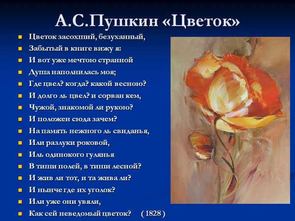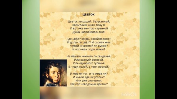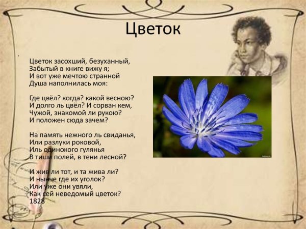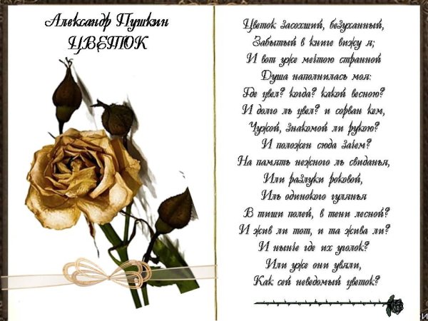 Иллюстрация к стихотворению Пушкина "Цветок" – это визуальное олицетворение красоты и нежности природы, которую поэт так мастерски передал своими словами. Уникальная композиция, созданная художником, позволяет зрителю окунуться в атмосферу стихотворения и увидеть цветок, который символизирует жизненные радости, эмоции и переживания. Каждая лепесточка и каждый оттенок на иллюстрации точно передают тонкие нюансы текста и доставляют удовольствие глазу. Эта великолепная работа художника станет прекрасным дополнением к любому произведению Александра Пушкина и подарит новые эмоции и вдохновение каждому, кто ее увидит.