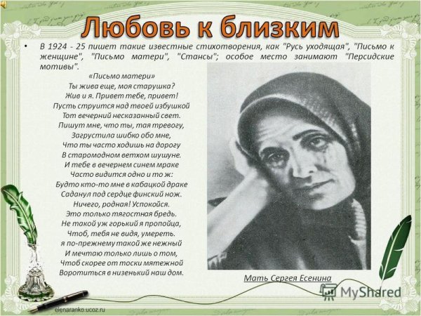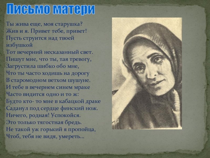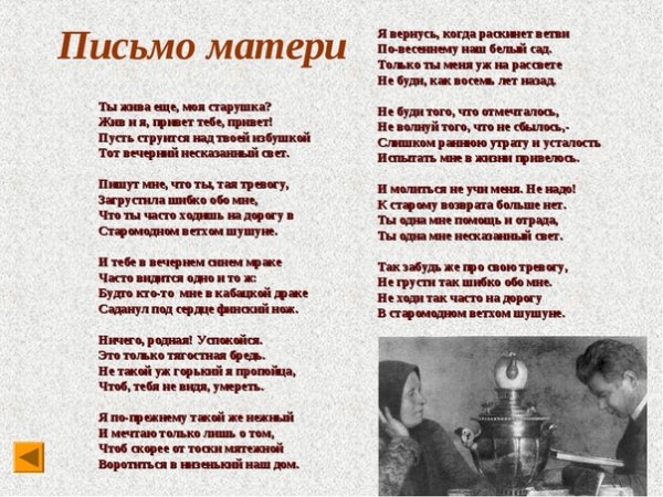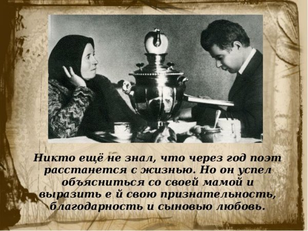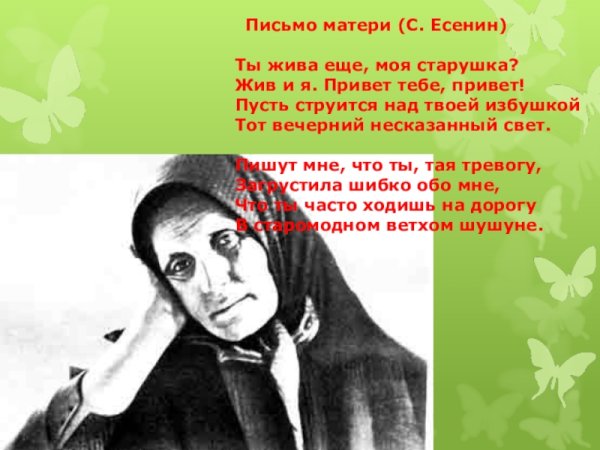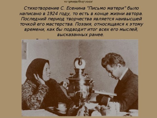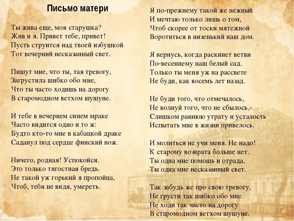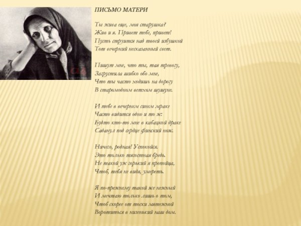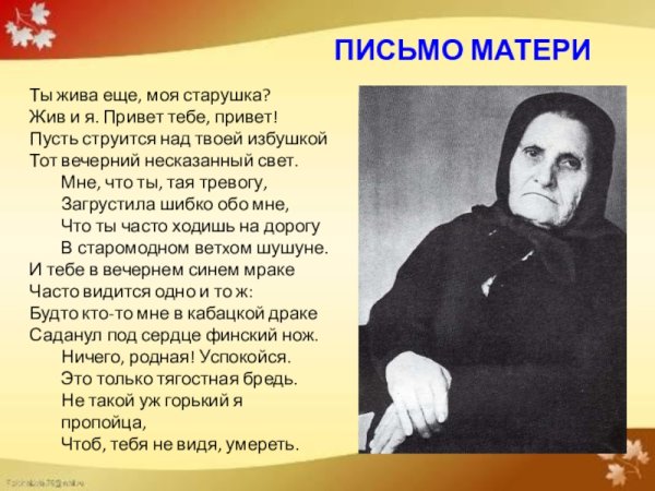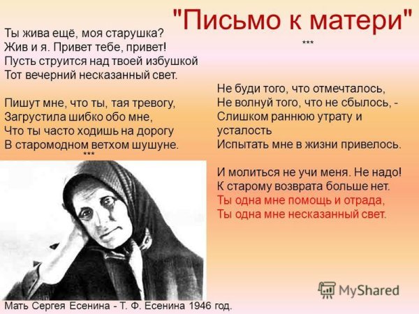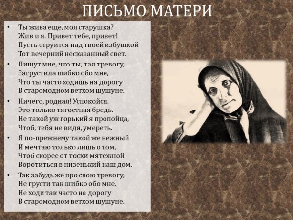 Иллюстрация к стихотворению "Письмо матери" является важной компонентой, которая помогает передать эмоциональную глубину и смысловую напряженность этого произведения. Визуальное изображение может подчеркнуть основные темы, такие как любовь, связь между матерью и ребенком, а также чувство ностальгии и разлуки. Отличный дизайн и использование цветовой гаммы помогут создать атмосферу, которая соответствует настроению стихотворения, и позволят зрителю более глубоко вникнуть в его содержание. Каждая деталь и элемент изображения должны быть тщательно продуманы, чтобы передать все тонкости и эмоции, которые переплетаются в этой поэтической работе. Иллюстрация к стихотворению "Письмо матери" может стать визуальной интерпретацией слов и помочь зрителю прочувствовать всю силу и значимость материнской любви и привязанности.