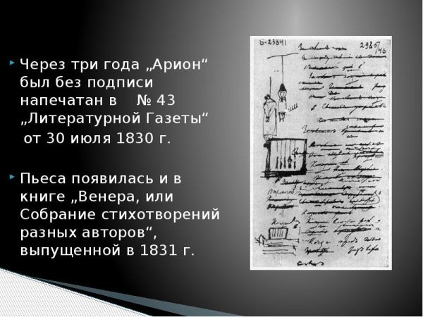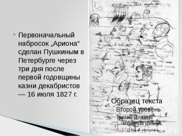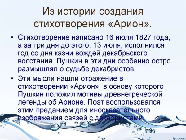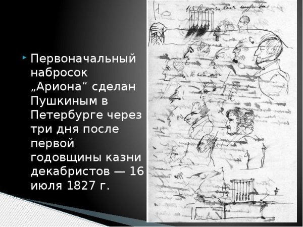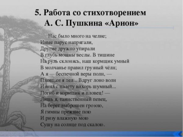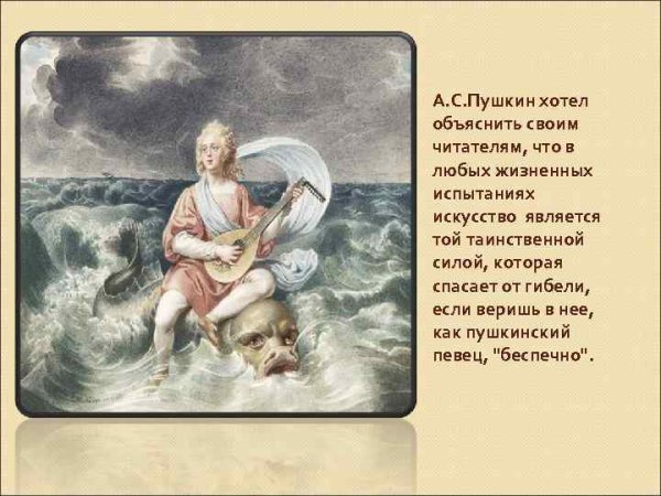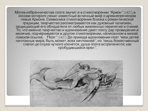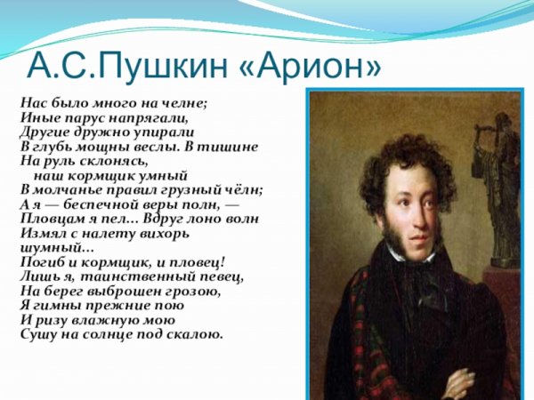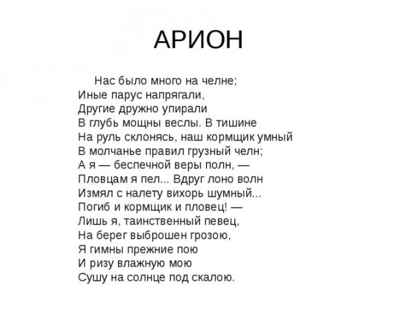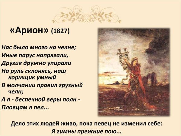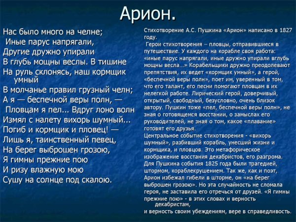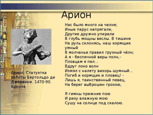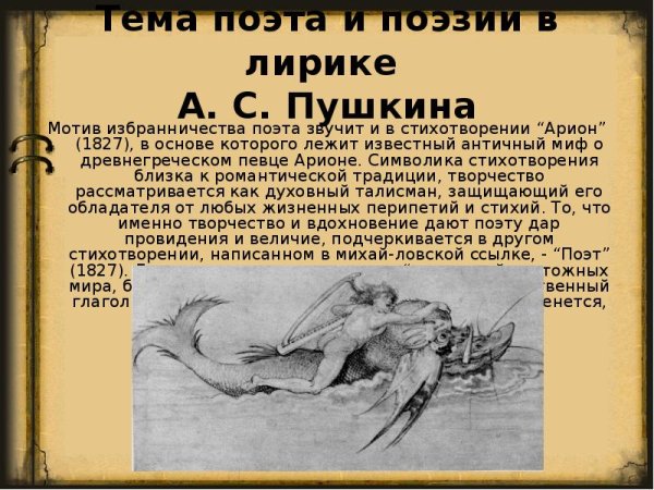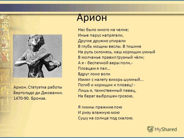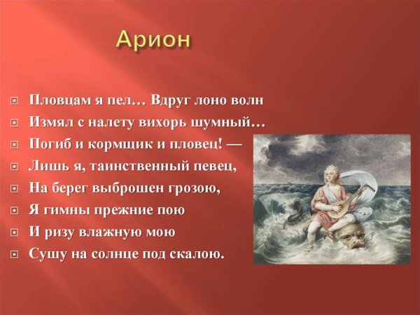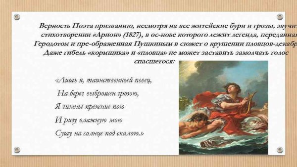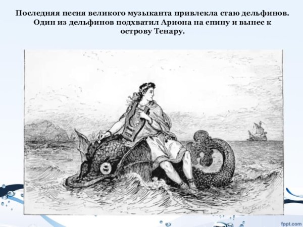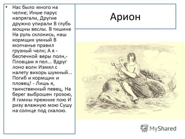 Иллюстрации к стихотворению "Арион" Александра Сергеевича Пушкина являются великолепным дополнением к этому известному произведению. Эпическая поэма, написанная в 1822 году, рассказывает о подвиге греческого певца Ариона, который совершил невероятное путешествие на спине дельфина. В своих иллюстрациях художники передали эмоциональную силу стихотворения и оживили его главных героев. Отображая моменты плавания Ариона на спине дельфина, художники создали невероятно красочные и динамичные картины, передающие чувство волшебства и приключения. С помощью ярких цветов и деталей они позволяют зрителю окунуться в атмосферу древнегреческой мифологии и побывать рядом с героем в его невероятном путешествии. Иллюстрации к стихотворению "Арион" Пушкина - это не просто декорация, а настоящее творчество, которое помогает визуализировать произведение и дополняет его смысловую глубину.