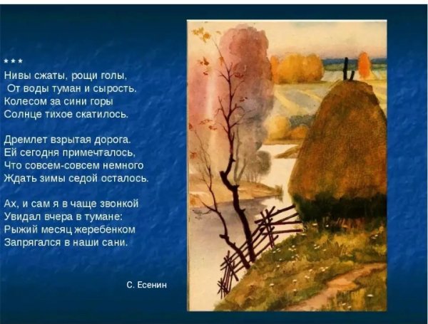 Иллюстрация к стихотворению Есенина "Нивы сжаты" воплощает перед читателем величие и красоту русской природы. На картине можно увидеть бескрайние поля, полностью заполненные золотистыми колосьями, которые дрожат на легком ветру. Яркое осеннее солнце окрашивает все вокруг в теплые оттенки, добавляя картине еще больше жизни и яркости. Вдали простерается небольшая деревня, где виднеются крыши изб и церковь, создавая ощущение уюта и спокойствия. Иллюстрация воспевает простоту и неповторимость русской деревни, а также обращает внимание на неизменную связь между человеком и природой. Это произведение искусства подарит зрителю возможность погрузиться в мир поэзии Сергея Есенина и ощутить всю его гармонию и красоту.