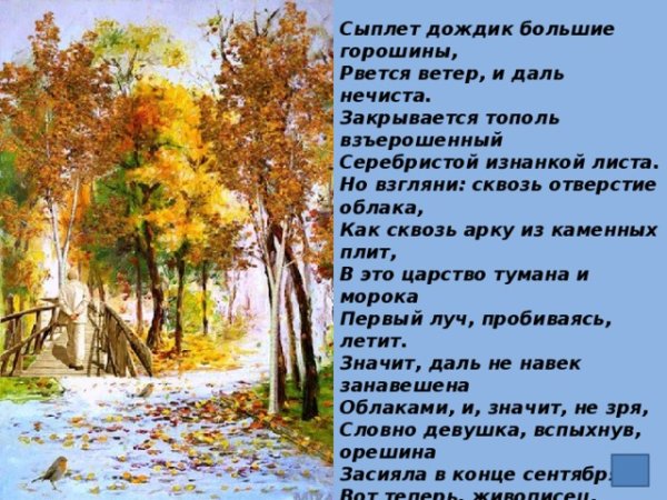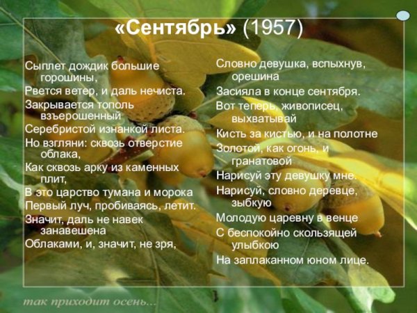 Иллюстрация к стихотворению Николая Заболоцкого "Сентябрь" погружает нас в атмосферу осеннего месяца, полного непредсказуемых перемен. В этих словах поэта мы видим отражение смены природы: листьев желтизна их падение, прохлада, запах дождя. Иллюстрация создает ощущение умиротворения и тишины, передавая спокойствие и гармонию с окружающей природой. Она вызывает в нас воспоминания о прекрасных осенних днях, наполняя наше сердце теплом и ностальгией. Благодаря иллюстрации к стихотворению "Сентябрь" Николая Заболоцкого, мы можем ещё глубже ощутить эту поэтическую картину осеннего месяца.