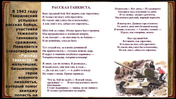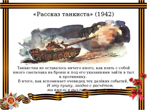 Танкист, сидя в своем железном гиганте, обозревает поле битвы, наполненное хаосом и разрушением. В его руках лежит не только мощное оружие, но и ответственность за жизни своих товарищей. Стальные стены танка стали для него как бы второй кожей, он точно знает каждый шаг своей машины, каждую кнопку и рычаг управления. Он чувствует себя одновременно сильным и уязвимым в этом безжалостном мире, где одна ошибка может стоить жизни. Но он не боится, потому что он находится в состоянии гармонии с танком, который стал продолжением его собственной воли. Он становится единым целым с этим могучим механизмом, способным преодолевать любые преграды и противостоять любым врагам. Иллюстрация к стихотворению, на которой изображен этот танкист, передает его силу, решимость и героический дух, который помогает ему выжить в этом суровом мире.