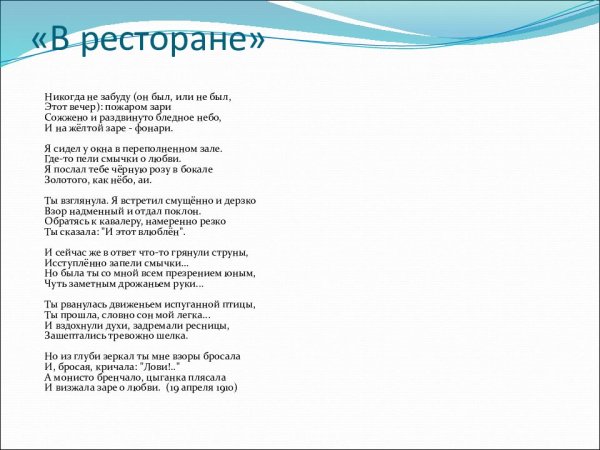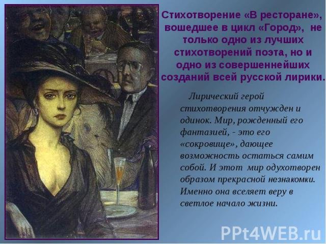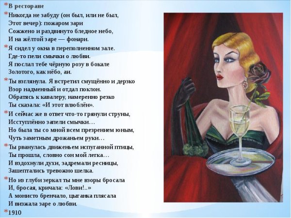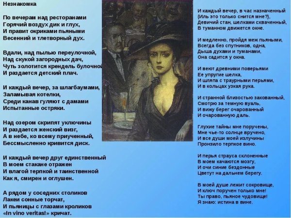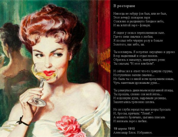 Иллюстрации к стихотворению Блока в ресторане - это уникальное объединение поэзии и изобразительного искусства. Великий русский поэт Александр Блок оставил нам свои проникновенные стихи, а сегодня художники создают яркие иллюстрации, которые отображают его мир и эмоции. Посетители ресторана имеют возможность насладиться не только вкусными блюдами, но и проникнуться глубиной и красотой слов блоковской поэзии. Иллюстрации помогают визуализировать образы и перенести читателя в мир Блока, где каждая строка стихотворения становится живой картиной. Они позволяют почувствовать всю глубину его мыслей и эмоциональную силу его произведений. Иллюстрации к стихотворению Блока в ресторане - это прекрасная возможность окунуться в его творчество и насладиться гармонией слов и изображений.