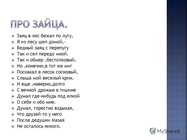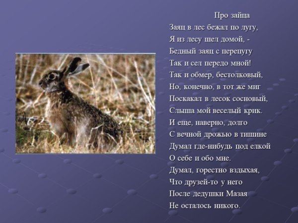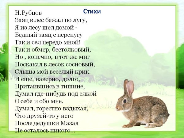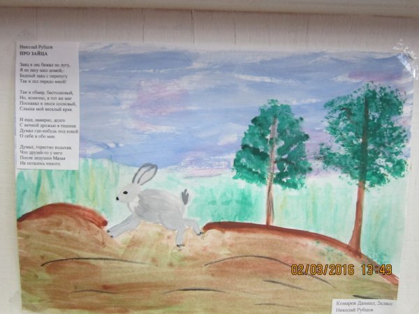 Прекрасная иллюстрация к стихотворению Рубцова про зайца позволяет нам окунуться в захватывающий мир природы и ощутить все эмоции, которые переживает главный герой. На этой картина мы видим изображение зайца в его естественной среде обитания - зеленых лугах, украшенных яркими цветами и пышными деревьями. Заяц изображен в движении, его мягкая шерсть блестит на солнце, а его глаза полны любопытства и игривости. Иллюстратор передал всю живость и непосредственность момента, создав уникальную атмосферу, в которой каждый зритель может почувствовать себя частью этого прекрасного мира. Эта иллюстрация отлично подчеркивает глубокие эмоциональные состояния самого зайца, его радость, страх, удивление или любовь, каких он может испытывать в своей жизни. Будучи неотъемлемой частью стихотворения Рубцова, эта иллюстрация помогает нам еще глубже погрузиться в магию слов и ощутить всю красоту и смысл стихов.