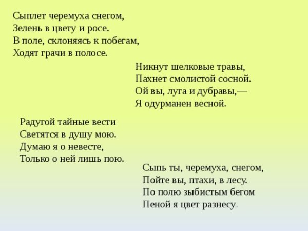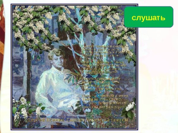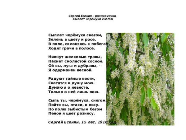 На этой красочной иллюстрации великолепно запечатлены все чарующие моменты стихотворения о сыплущейся черемухой, словно снегом. С изящностью пера художника на белом фоне раскинулись ветви дерева, увенчанные крупными белоснежными цветами. Они своими пушистыми лепестками напоминают падающий снег, создавая впечатление магического зимнего пейзажа. Красота этих черемуховых сугробов словно погружает зрителя в сказочную атмосферу, где время останавливается, и все вокруг замерло в ожидании чуда. Картинка прекрасно передает суть стихотворения, заставляя сердце замирать от изумления и восхищения перед природным великолепием.