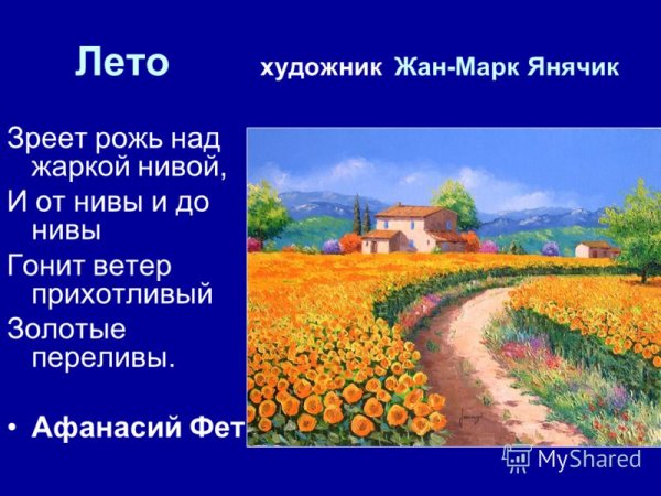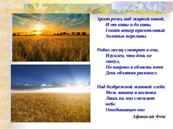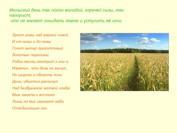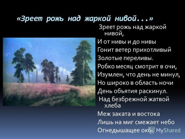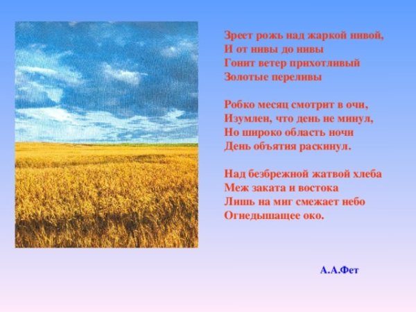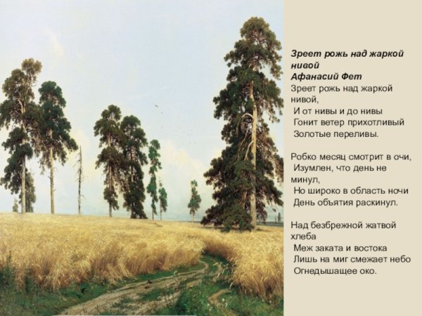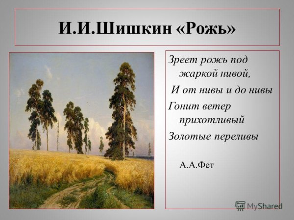 Иллюстрация к стихотворению "Фета зреет рожь" - это визуальное изображение, которое передает атмосферу и смысл данного стихотворения. Рожь является символом плодородия и урожайности, а Фет – одним из величайших русских поэтов. Изображение может представлять золотистые колосья ржи, готовые к уборке, на фоне заката или распаханного поля. Оно создает ассоциацию с природой, трудолюбием и богатством, которые присутствуют в стихах Фета. Иллюстрация помогает визуализировать и углубить восприятие этого стихотворения, подчеркивающего красоту природы и ее связь с человеческой душой.