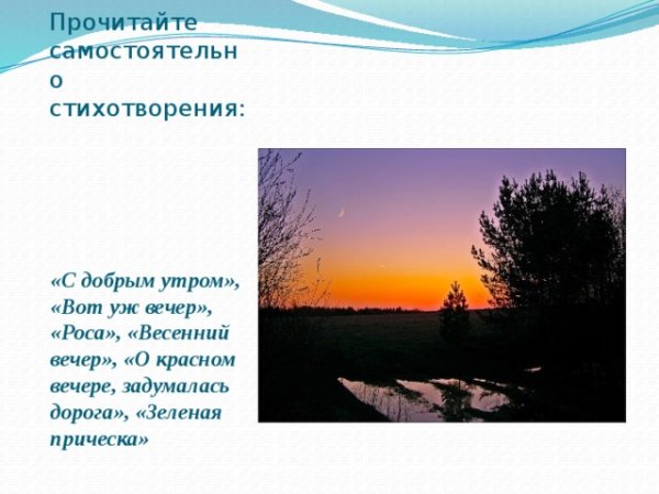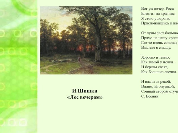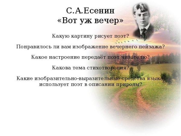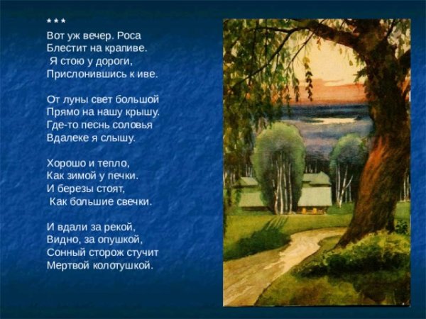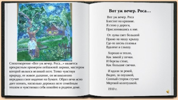 Иллюстрация к стихотворению Есенина "Вот уж вечер" — это неповторимое произведение искусства, которое передает атмосферу вечера, его таинственность и загадочность. Великолепная композиция и яркие цвета позволяют ощутить гармонию с природой и проникнуться ее красотой и меланхолией. Изображение восхода солнца или захода, тихого озера или осеннего леса может стать идеальным дополнением к этому стихотворению, подчеркивающим его глубокий смысл и эмоциональную насыщенность. Эта иллюстрация создает атмосферу, в которой каждый зритель может открыть для себя новые смыслы и переживания, обогатив свою внутреннюю жизнь.