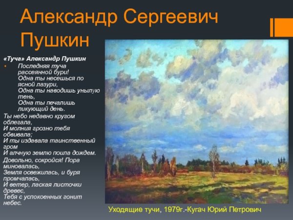 Иллюстрация к произведению Пушкина "Туча" является визуальным отражением мрачной и загадочной атмосферы этого стихотворения. На картине можно увидеть темное небо, перекрытое плотными облаками, которые создают ощущение грозы и неожиданных событий. В центре изображения находится одинокая туча, которая символизирует не только приближающийся шторм, но и внутренний конфликт героя произведения. Композиционно и мастерски выполненная иллюстрация передает все эмоциональные и драматические нюансы стихотворения, заставляя зрителя задуматься над его глубоким смыслом.