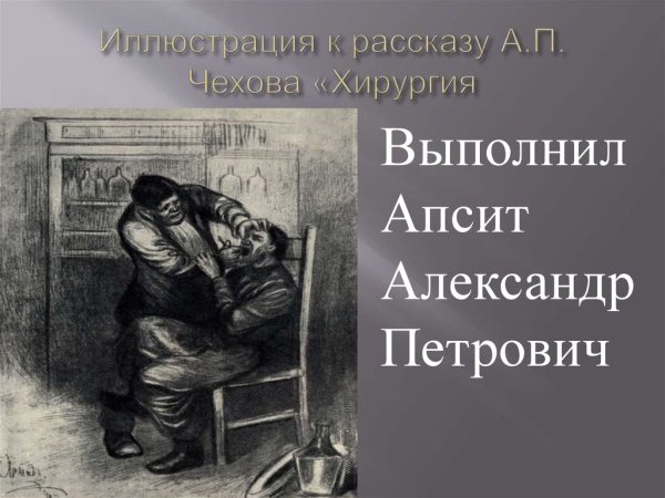 Рисунок является важной иллюстрацией к знаменитому рассказу Антона Чехова "Хирургия". Он отображает сцену операции, где хирург весьма усердно работает, окруженным медицинскими инструментами и переживающими пациентами. Изображение передает атмосферу напряжения, профессионализма и ответственности, присущую данной сфере деятельности. Реалистичная стилистика и мастерство автора рисунка помогают зрителю почувствовать всю драматичность момента и запомнить его на долгие годы. Эта иллюстрация является ключевым элементом визуального представления о рассказе "Хирургия" и подчеркивает его значимость и актуальность.