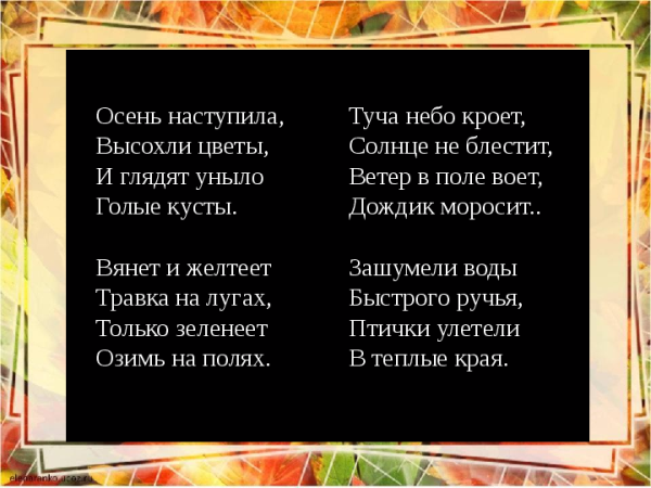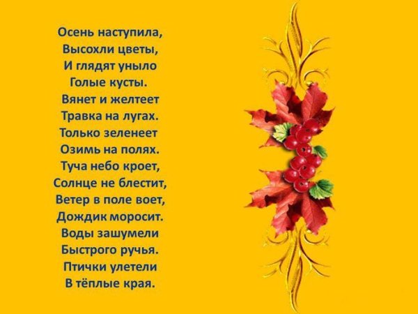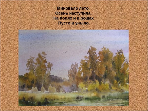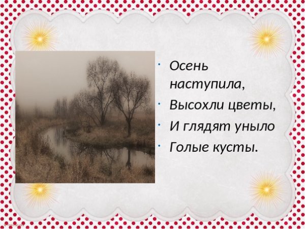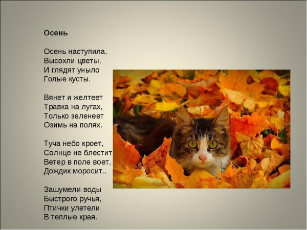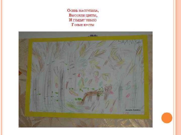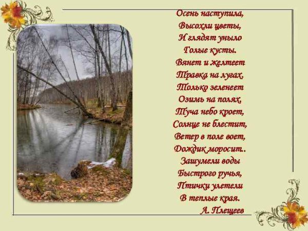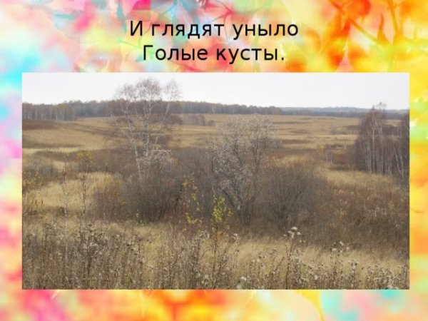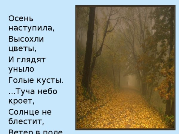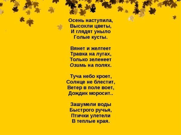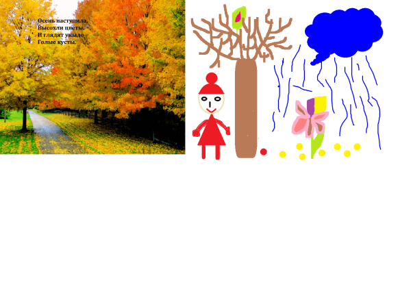 «Осень наступила, и природа пробуждает в нас незабываемые эмоции. Одинокие листья падают с деревьев, а золотистые тучи заполняют небо. В этом полотне осени мы видим иллюстрацию к стихотворению, где цветы, которые однажды радовали нас своей яркой красотой, высохли и увяли. Их увядание символизирует окончание лета и приближение холодного времени года. Когда мы смотрим на эти высохшие цветы, они напоминают нам о преходящем времени и о том, что все красивое имеет свой срок жизни. Таким образом, эта иллюстрация становится отражением мимолетности моментов прекрасной осени и призывает нас наслаждаться каждым мгновением и не упускать возможность зажечь своим цветом в этом прекрасном сезоне».
