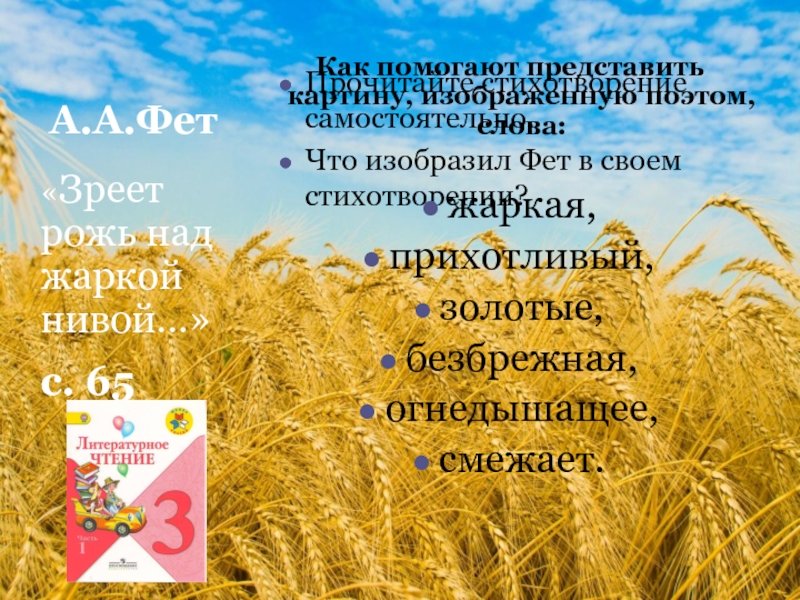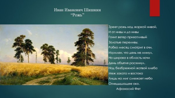 Иллюстрация к стихотворению "Фета зреет рожь над жаркой нивой" воплощает в себе образ летнего пейзажа, наполненного яркими красками и жизнью. На иллюстрации можно увидеть золотистые колосья ржи, достигшие зрелости под палящим солнцем, простирающиеся на бескрайней ниве. Они создают ощущение тепла и изобилия, отражая гармонию природы и человека. Игра света и теней добавляет глубину и объемность картине, а обрамление изображения в нежные зеленые тона передает спокойствие и естественность местности. Эта иллюстрация заставляет почувствовать запах летнего полдня и окунуться в атмосферу романтики и вечности, которую олицетворяет стихотворение Фета.