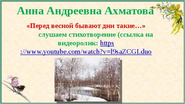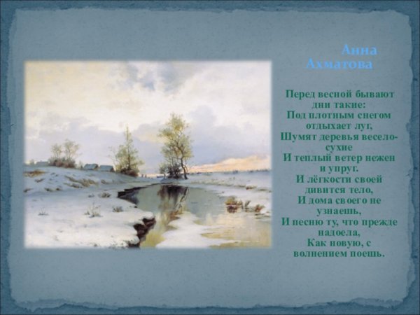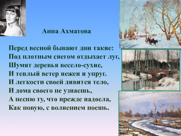 Иллюстрация к стихотворению Анны Ахматовой "Перед весной" - это потрясающая визуальная интерпретация настроения, которое может возникнуть у каждого из нас перед приходом долгожданной весны. В этих днях, когда зима еще не совсем отступила, но уже ощущается тепло и свежесть воздуха, ощущается особая атмосфера ожидания и возрождения. Иллюстрация передает эту атмосферу через использование нежных и ярких цветов, изображение бутонов раскрывающихся на деревьях, легкий ветерок, который играет с волосами главной героини. Она создает ощущение легкости, радости и надежды, что скоро наступит прекрасное время года, наполненное новыми возможностями и радостными моментами. Эта иллюстрация поднимает настроение и вызывает желание окунуться в атмосферу весны, насладиться ее красотой и обновляющей энергией.