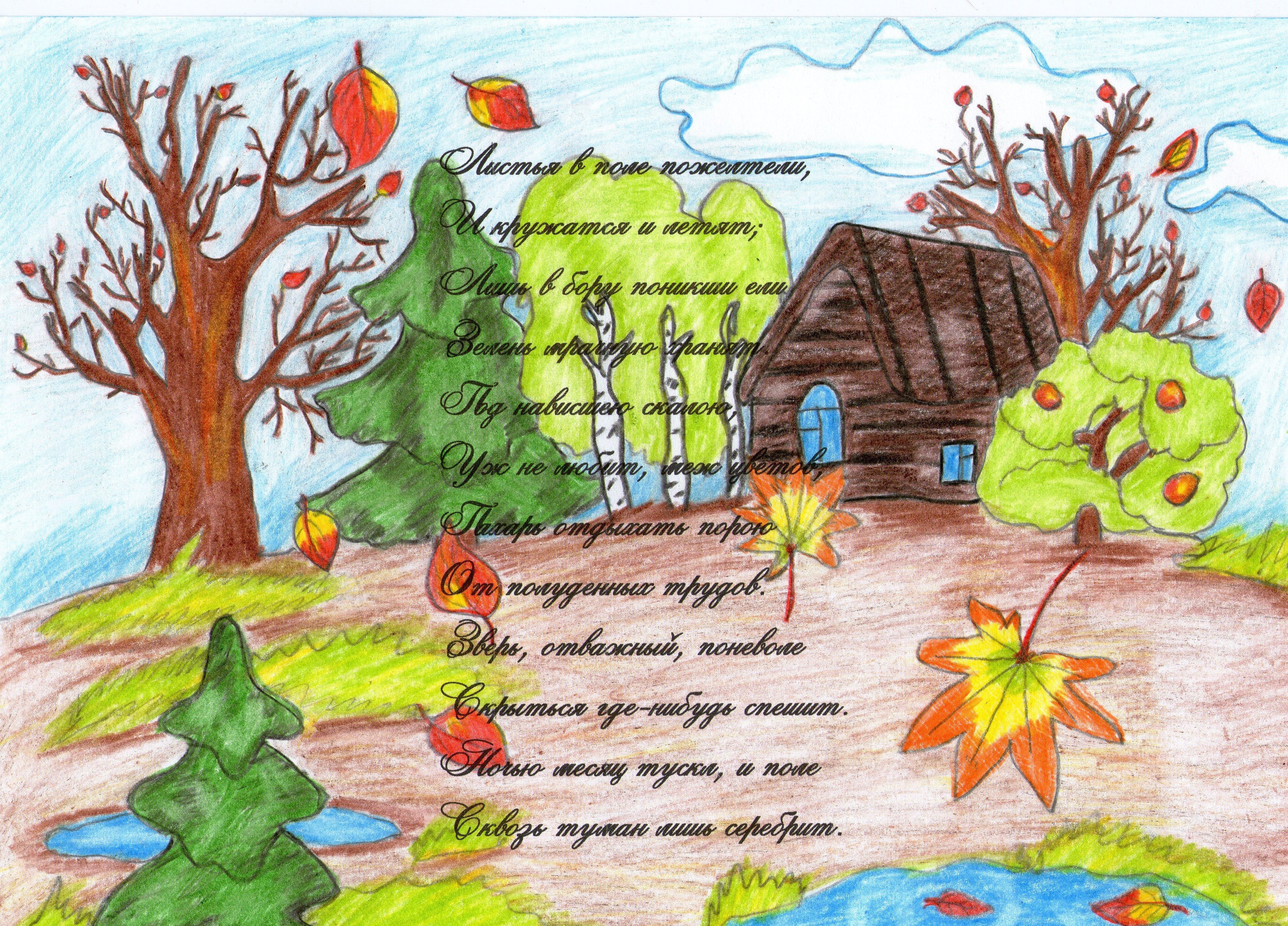 Осень - это пора, когда природа преображается, погружаясь в теплые оттенки и насыщенные цвета. Иллюстрация к стиху Лермонтова "Осень" передает всю красоту и меланхолию этого времени года. На рисунке можно увидеть сухие желтые листья, падающие с деревьев, их осыпающуюся красоту, которая словно тает на широком полотне. Осенний пейзаж наполняется ощущением тишины и умиротворения, а ветер, играя с листьями, создает музыкальное сопровождение этой поэтической картине. Все нюансы осеннего настроения и переживаний находят свое отражение в иллюстрации, придающей стихам Лермонтова новую глубину и эмоциональность.